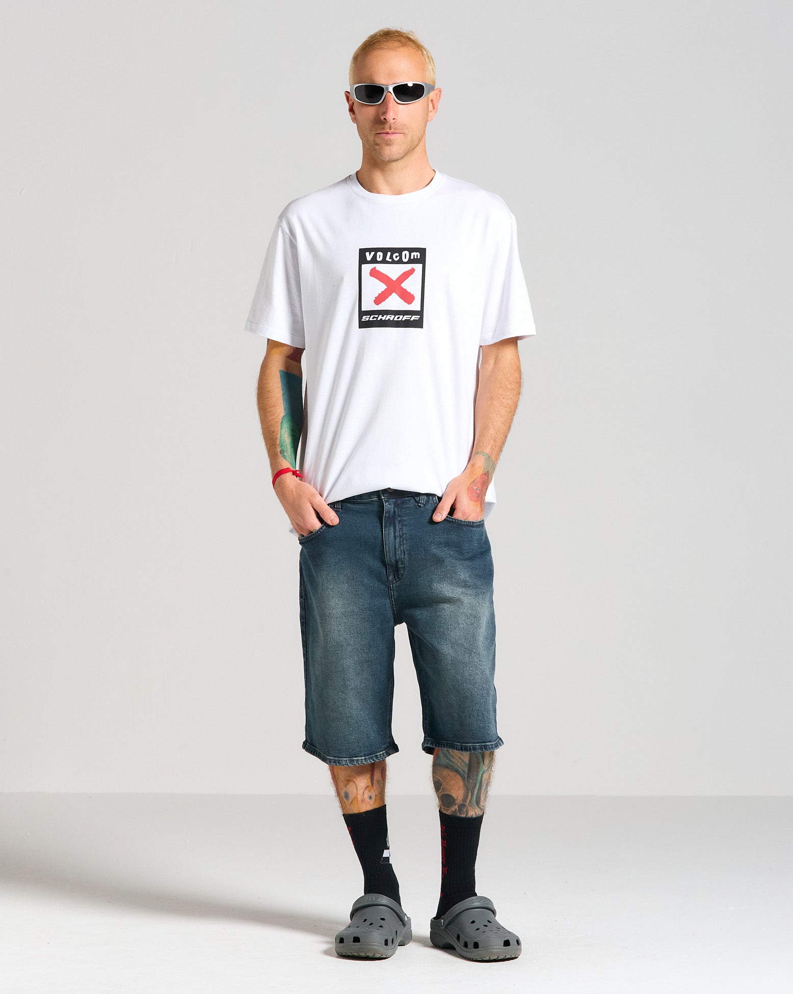 Bermuda Jeans Volcom Dark Blue Kinkade. Possui modelagem ampla, duplo passante, patch no cós traseiro, bordado Volcom Stone na perna, bordado Volcom no bolso traseiro, Volcom Stone bordado na perna e estampa em silk no forro do bolso.