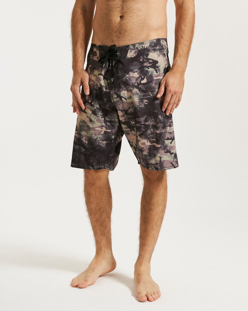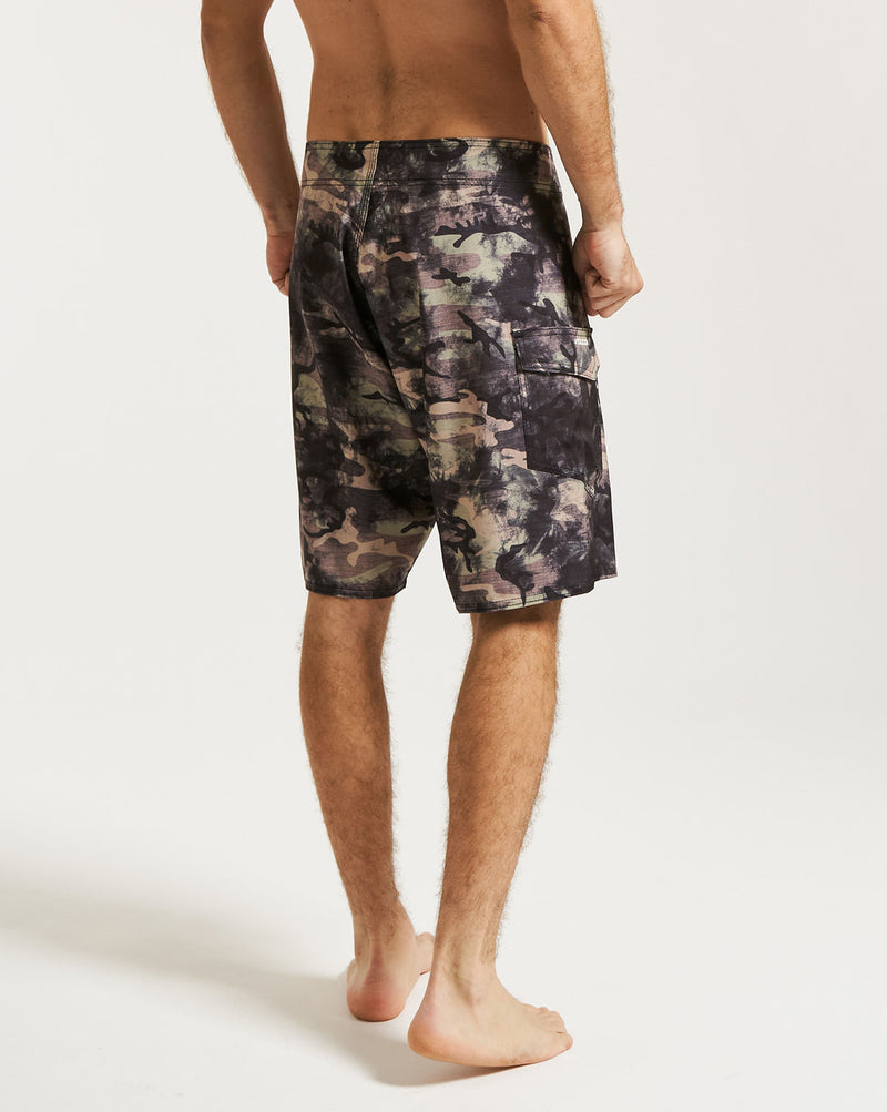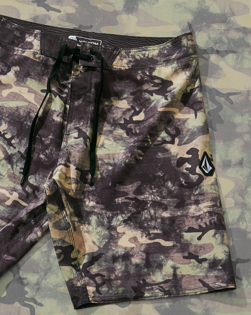 O Boardshort Volcom Lido Camo. Possui 19 polegadas de comprimento, tecnologia 4-way stretch, tecido leve e de secagem rápida, bolso lateral com lapela e patch Volcom Stone lateral.