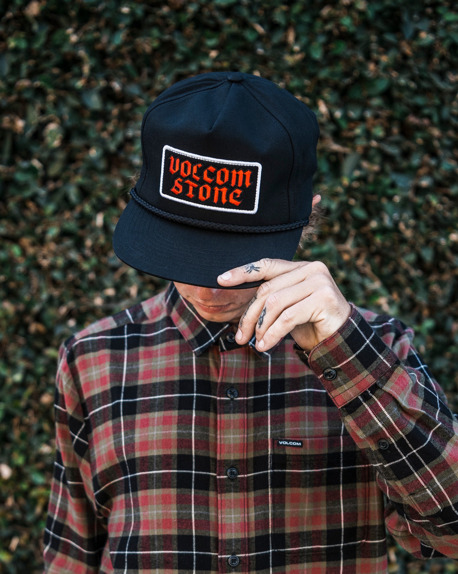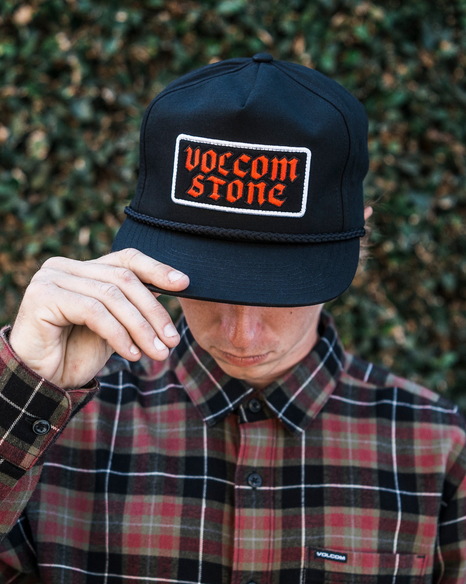 Boné Volcom No Brainer. Possui patch bordado frontal, detalhe de corda trançada na aba, construção com 5 painéis, aba reta, fecho ajustável snapback e etiqueta Volcom Stone no fecho.