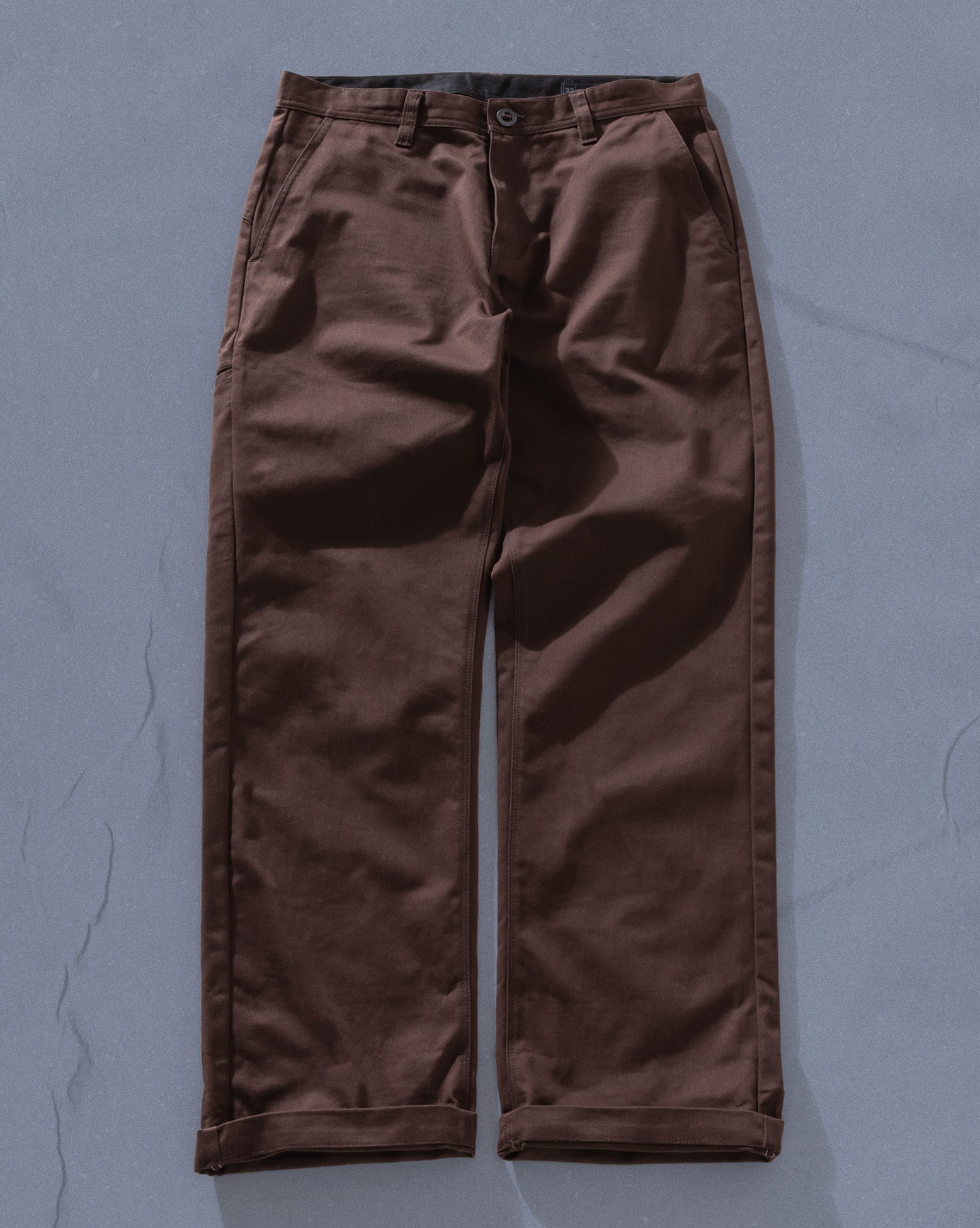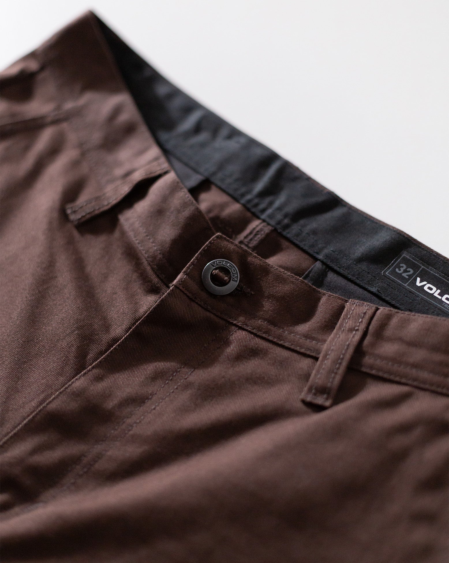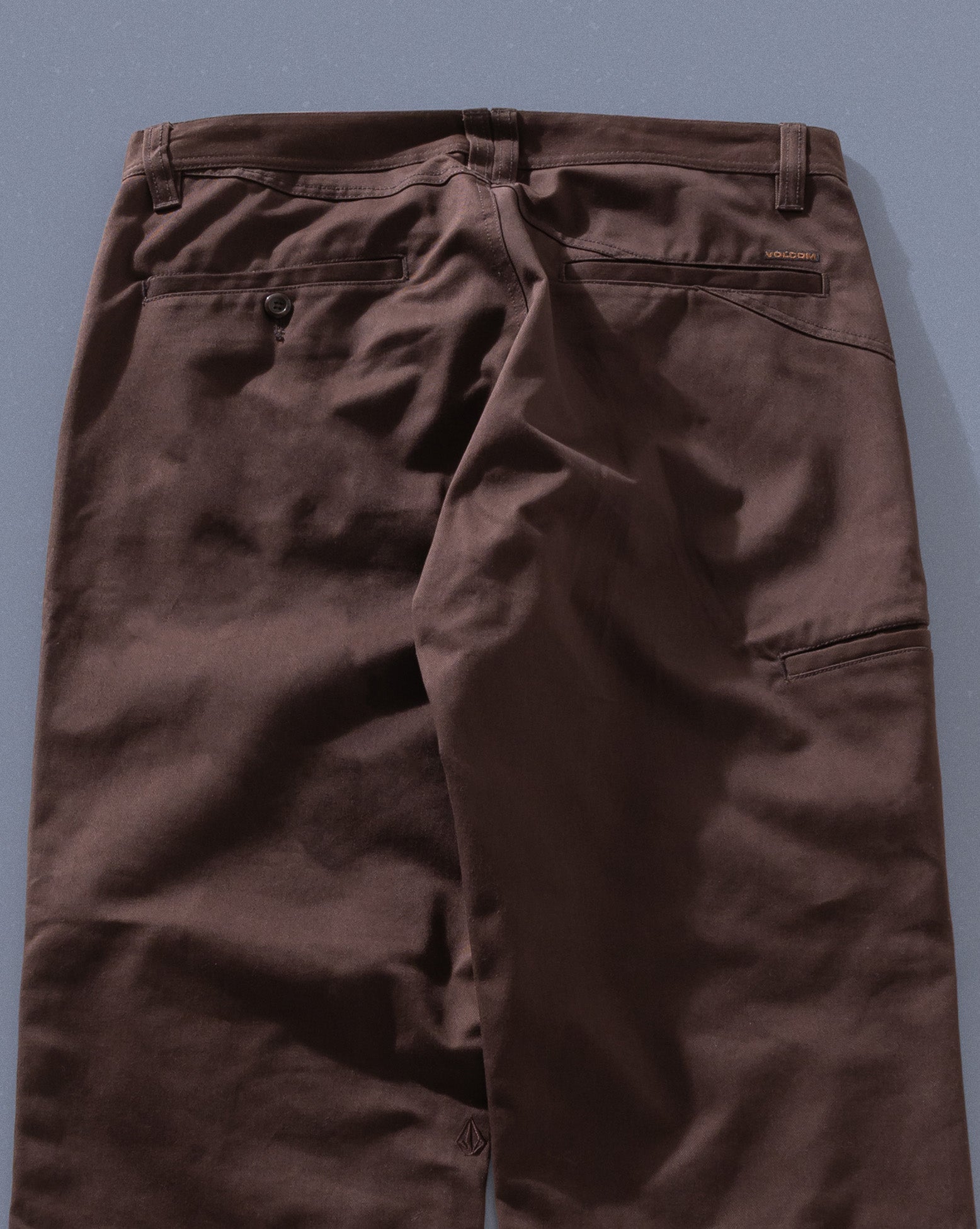 Calca Especial Volcom Frickin Chino Cacao. Possui modelagem ampla, múltiplos bolsos, bordado Volcom Stone na perna, bordado Volcom no bolso traseiro, botão indestrutivel, fechamento em zíper, pala traseira assimétrica, tecido em sarja e silk interno.