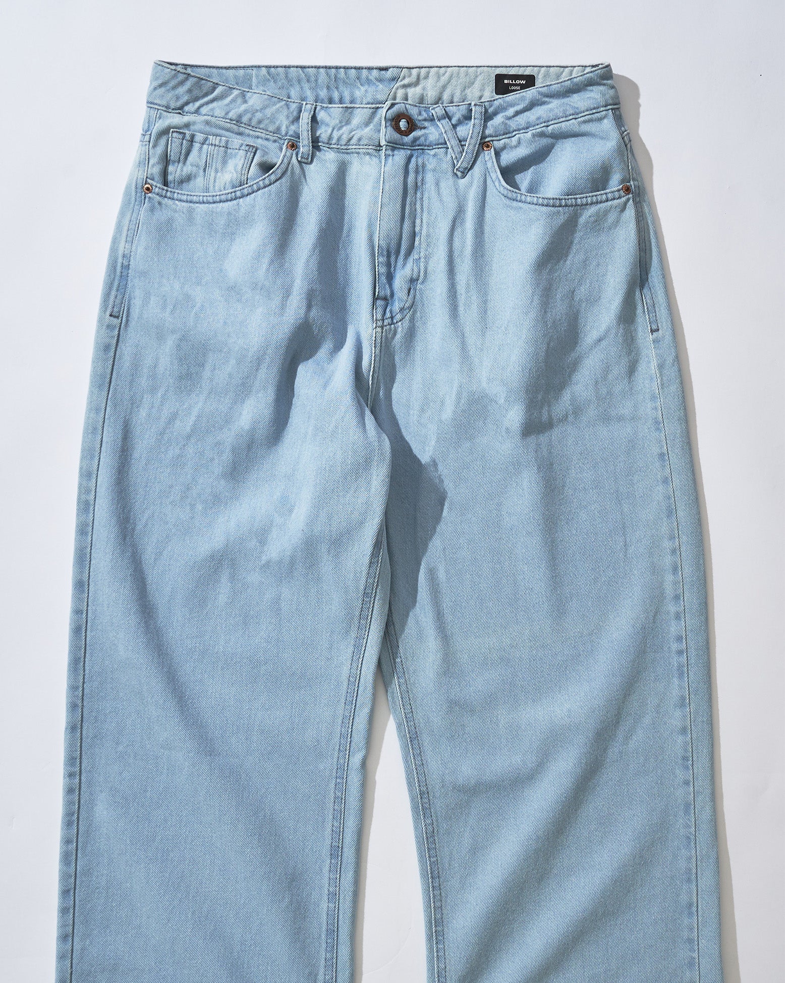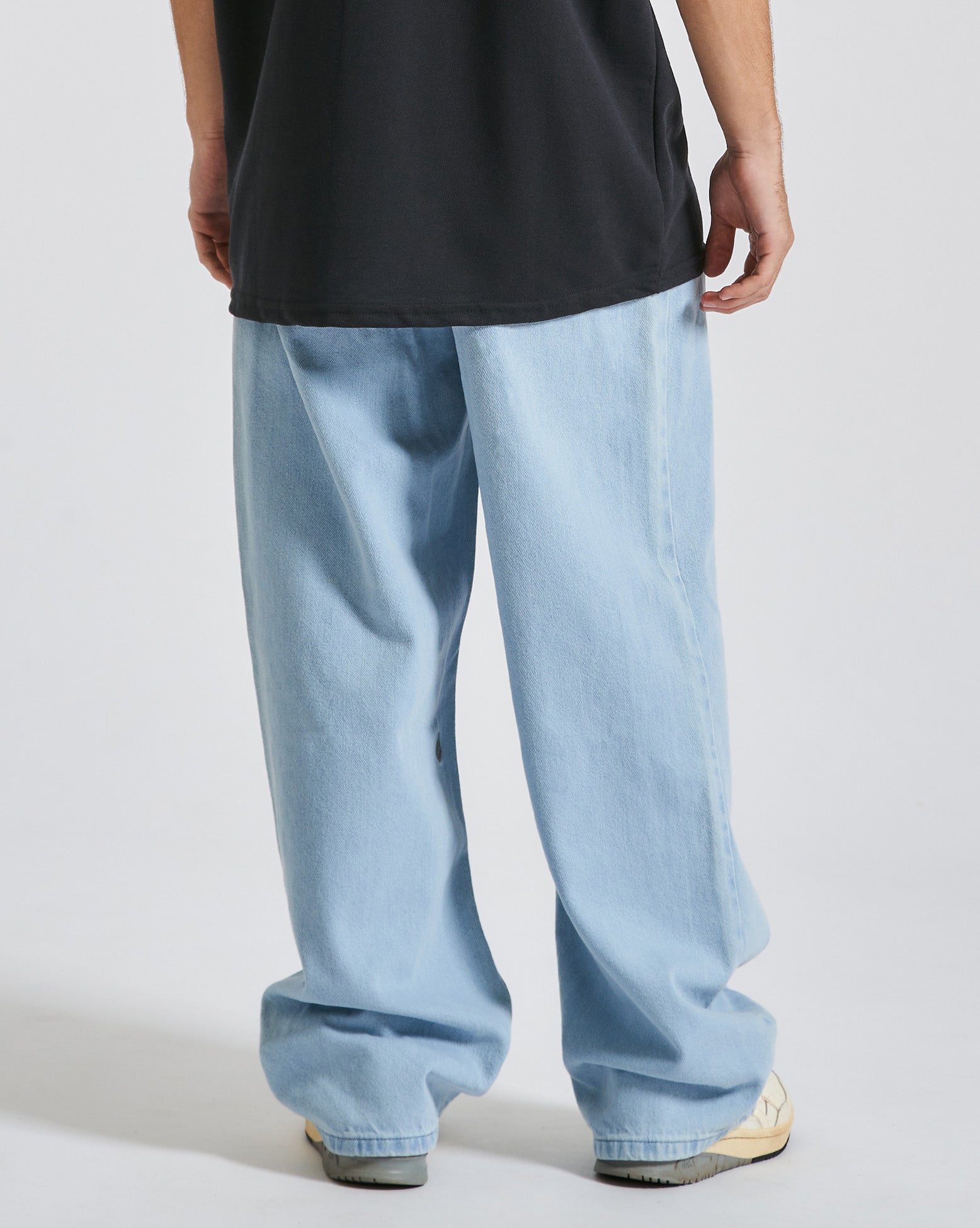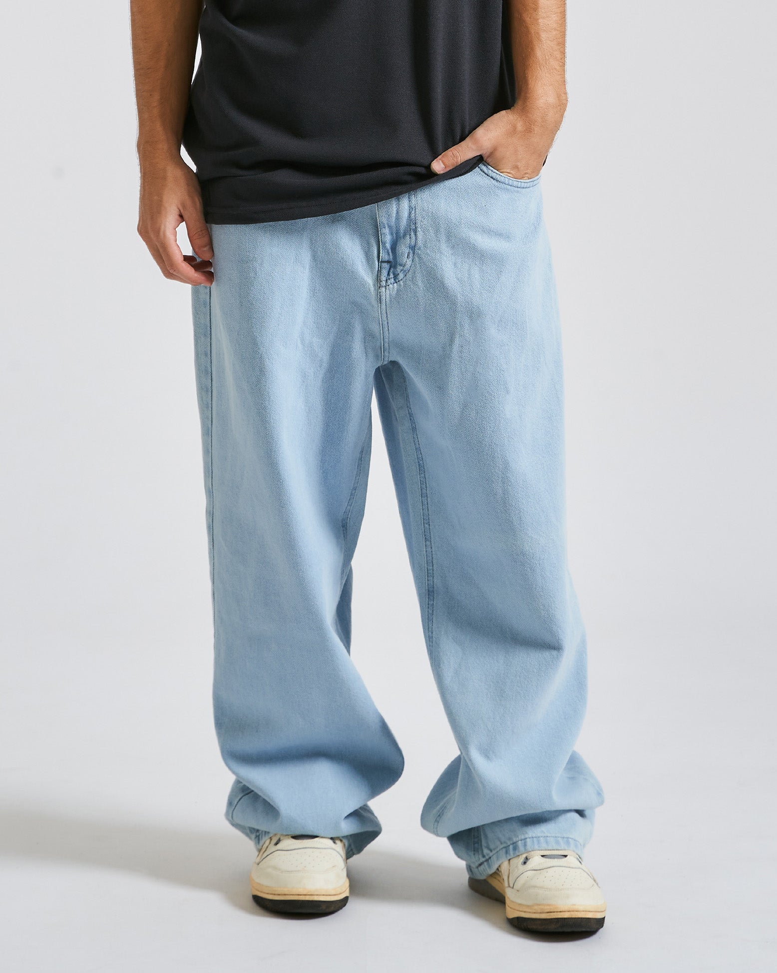 Calça Jeans Volcom Clear Blue Billow. Possui modelagem super ampla, duplo passante, múltiplos bolsos, bordado Volcom Stone na perna, bordado Volcom no bolso traseiro, pala traseira assimétrica e patch no cós traseiro.