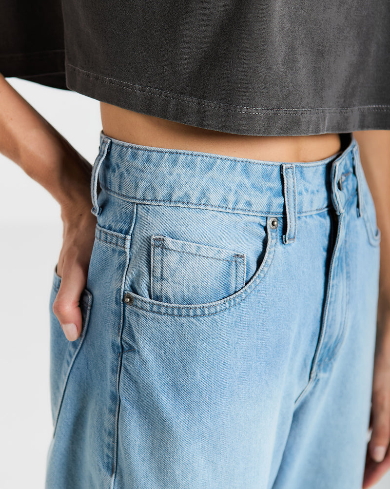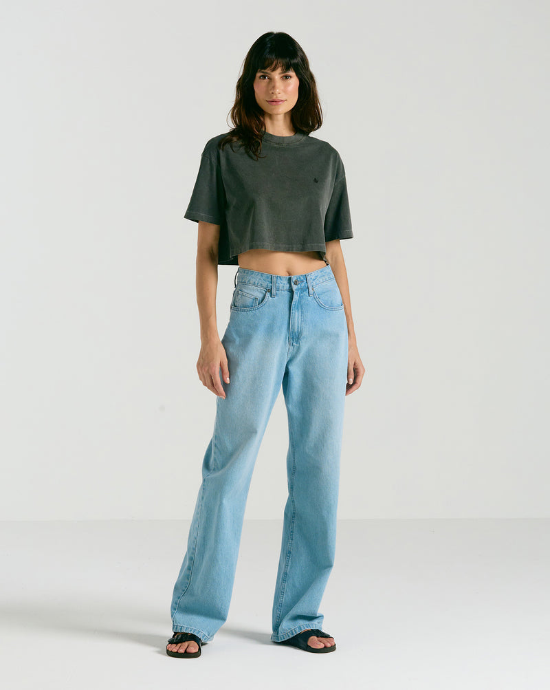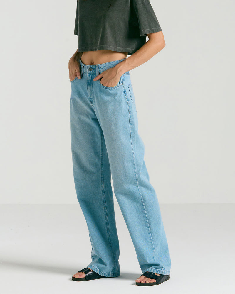 Calça Jeans Volcom Daddio. Possui modelagem cintura alta relaxed, patch Volcom no cós traseiro, bordado Volcom Stone na perna, etiqueta Volcom no bolso traseiro e lavanderia amaciada com efeito used.