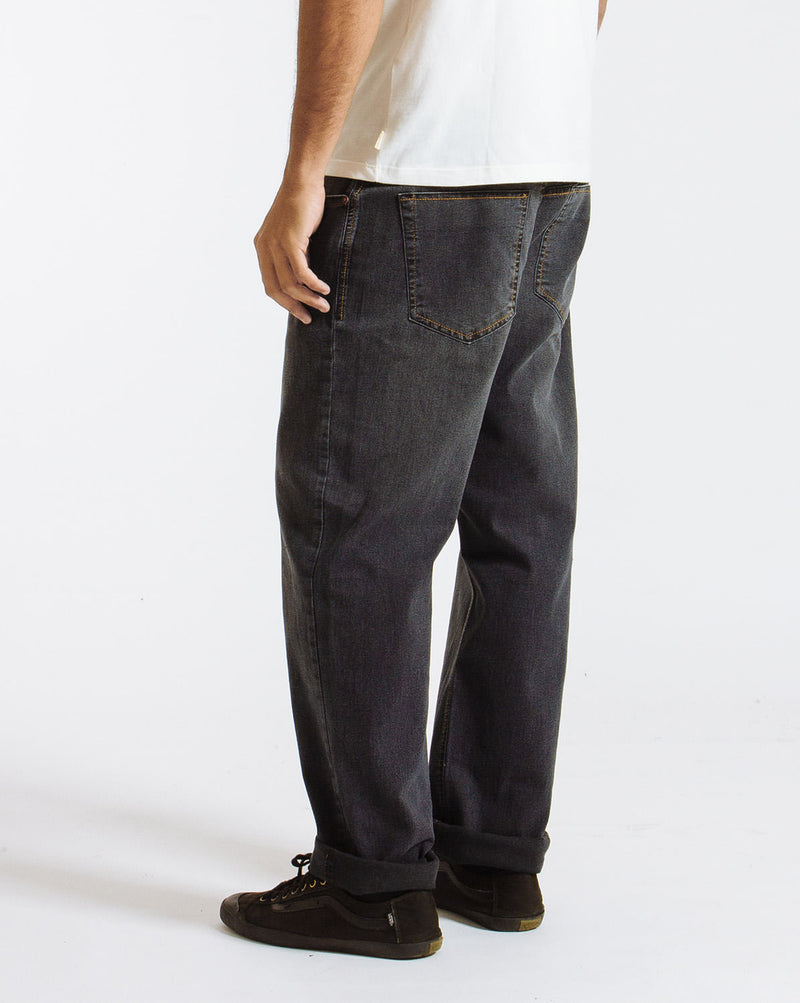 Calça Jeans Volcom Dark Black Kinkade. Possui modelagem ampla, duplo passante, bordado Volcom Stone na perna, bordado Volcom no bolso traseiro e patch no cós.