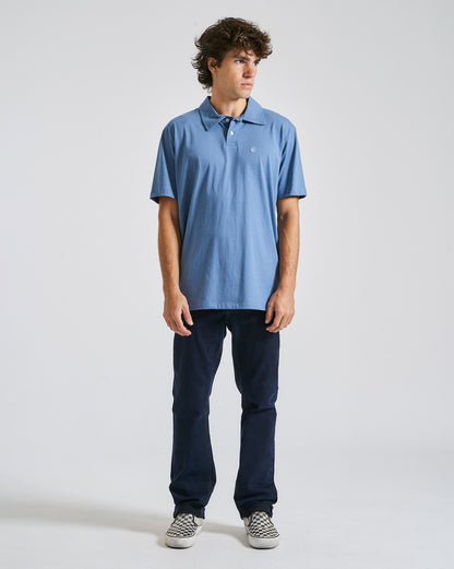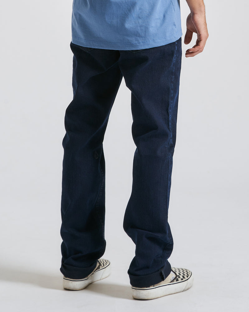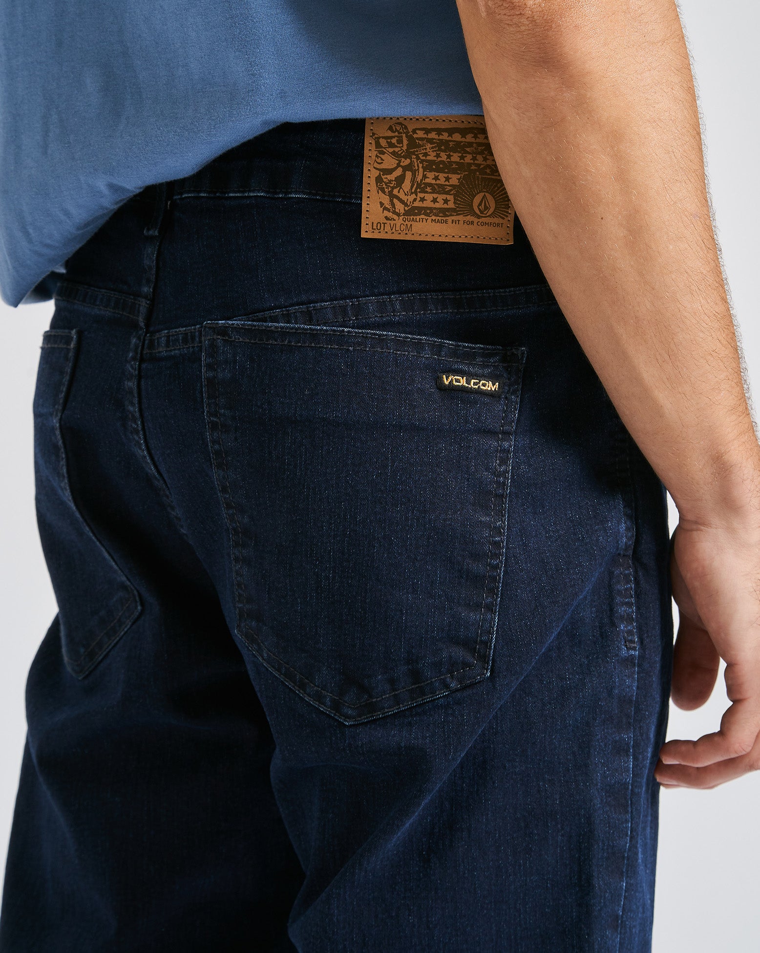 Calça Jeans Volcom Dark Blue Vorta. Possui modelagem slim, duplo passante, patch no cós traseiro, bordado Volcom Stone na perna e no bolso traseiro e estampa em silk no forro do bolso.