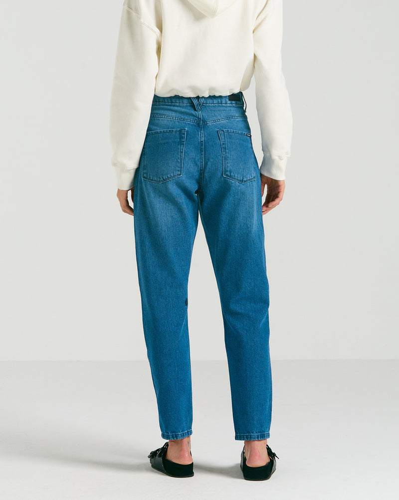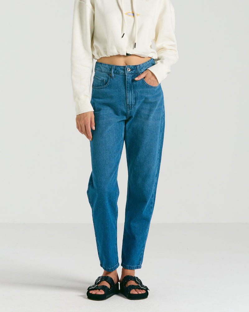 Calça Jeans Volcom Stoned High Rise. Possui modelagem mom jeans, patch Volcom no cós traseiro, bordado Volcom Stone na perna, etiqueta Volcom no bolso traseiro e lavanderia amaciada com efeito used.