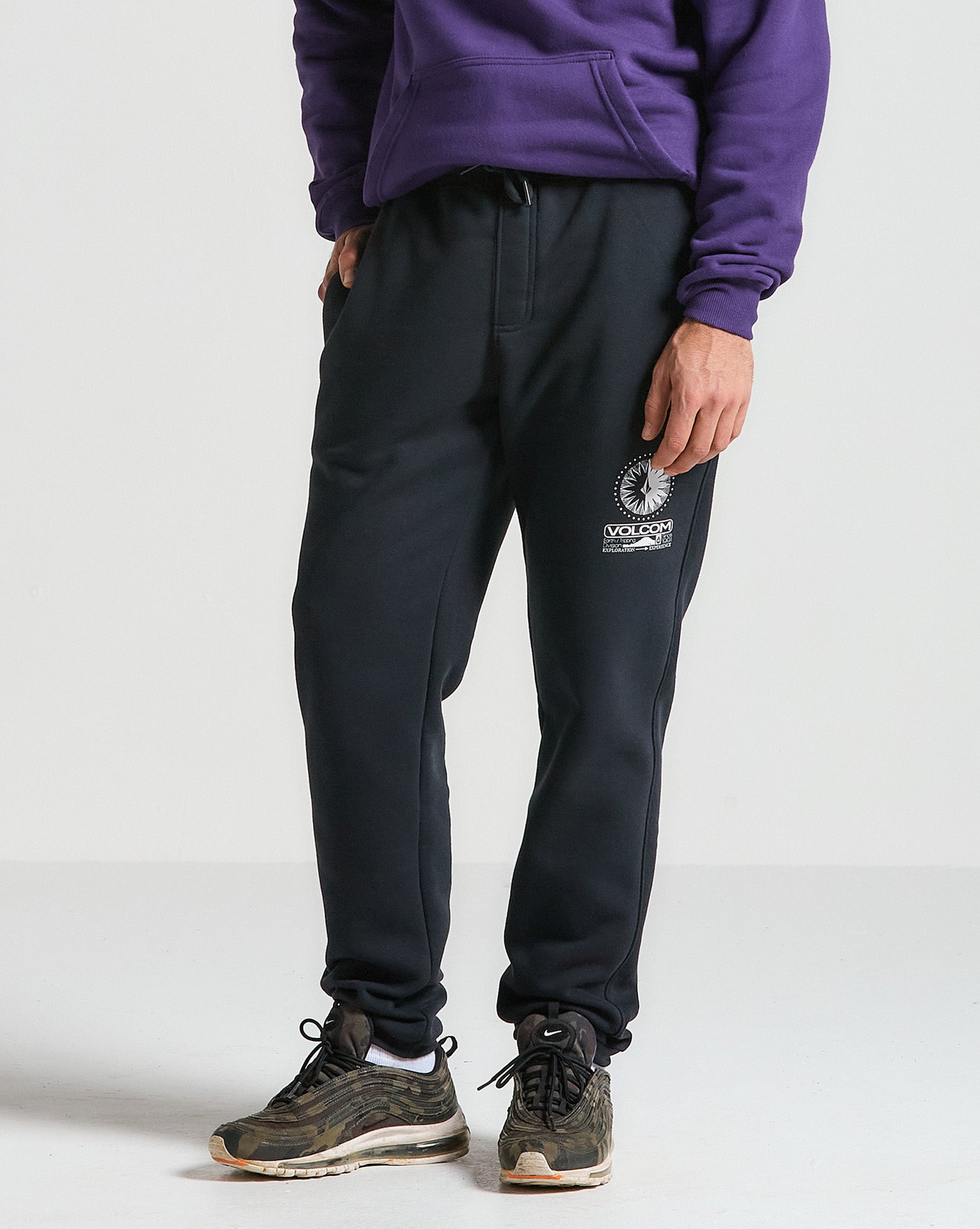 Calça Moletom Volcom Out There. Possui modelagem regular, estampa em silk na perna, bolso faca lateral, ajuste em cordão, bordado Volcom Stone na perna e etiqueta Volcom no bolso traseiro.