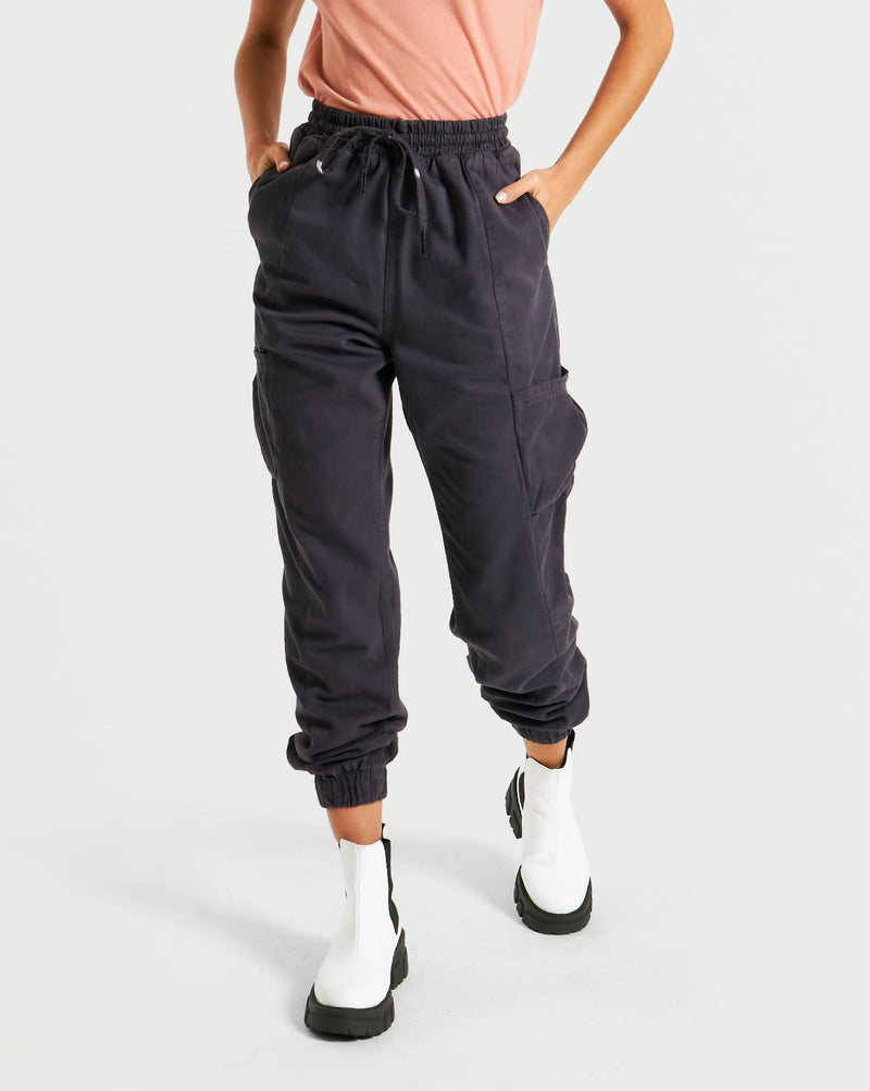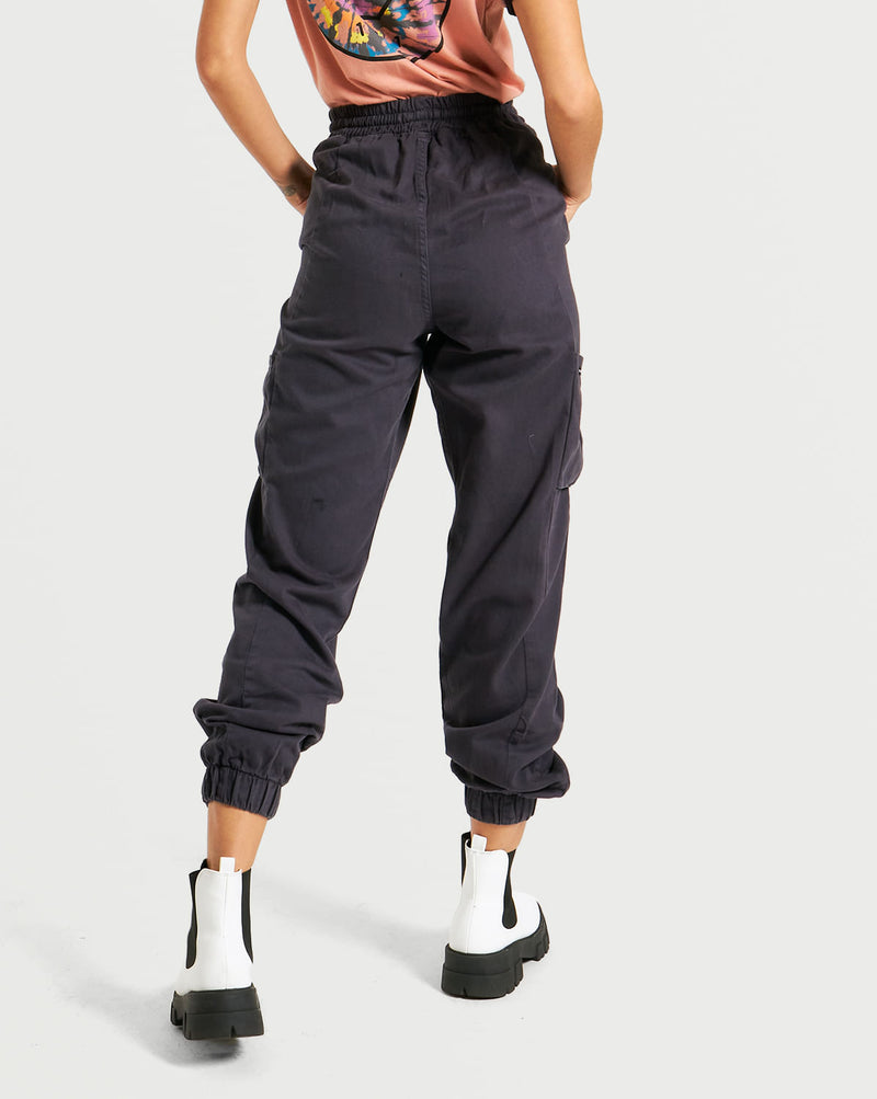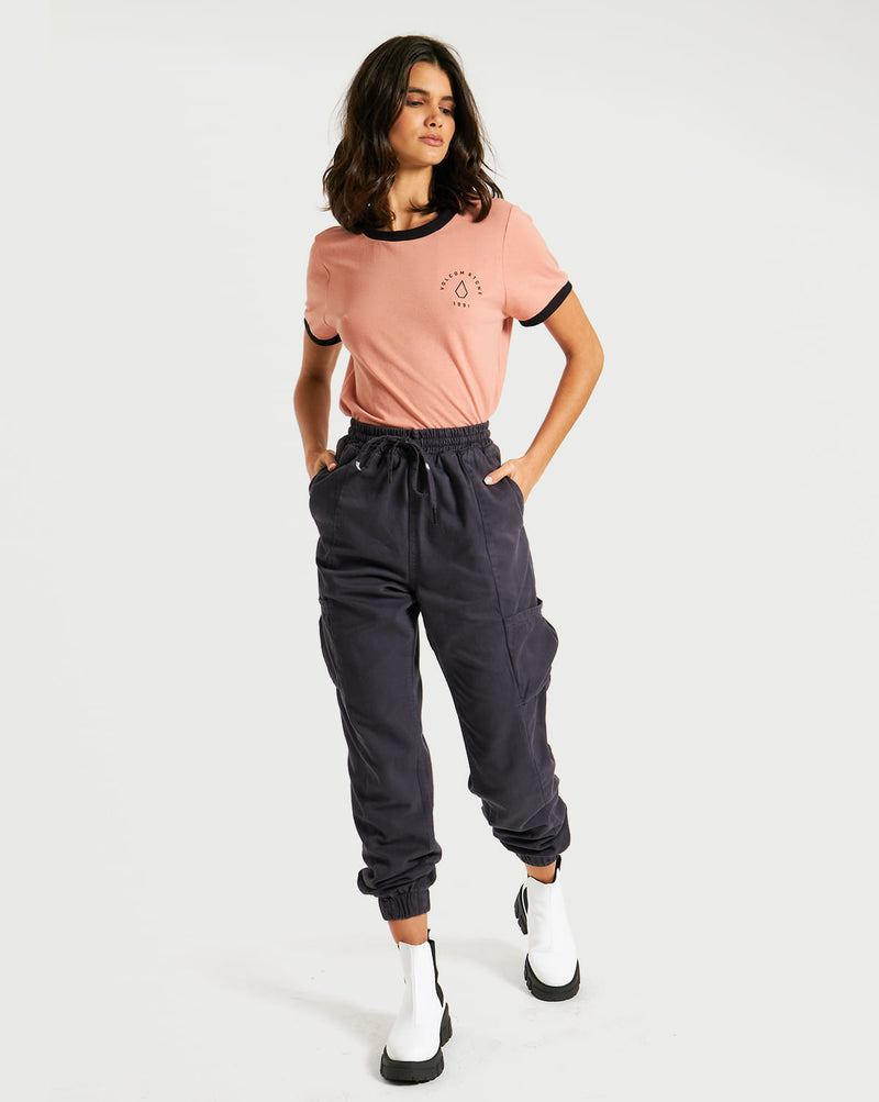 Calça Volcom All In. Possui modelagem cintura alta, ajuste em cordão, múltiplos bolsos e elástico na cintura e na barra.