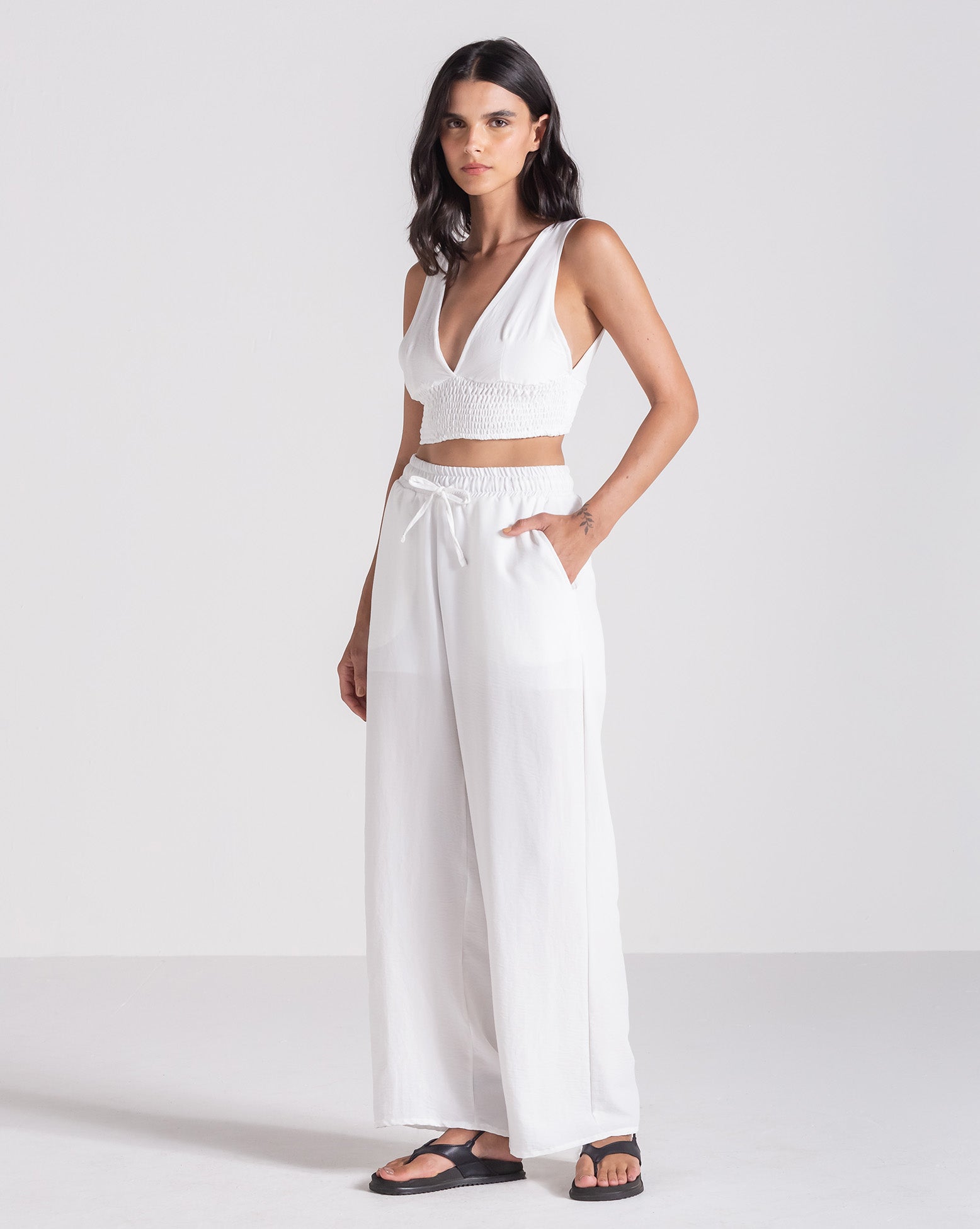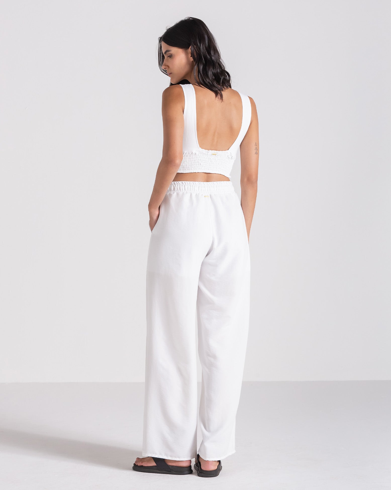 Calça Volcom Dream Branca. Possui modelagem pantalona cintura alta, elástico no cós, bolso faca lateral e plaquinha de metal Volcom.
