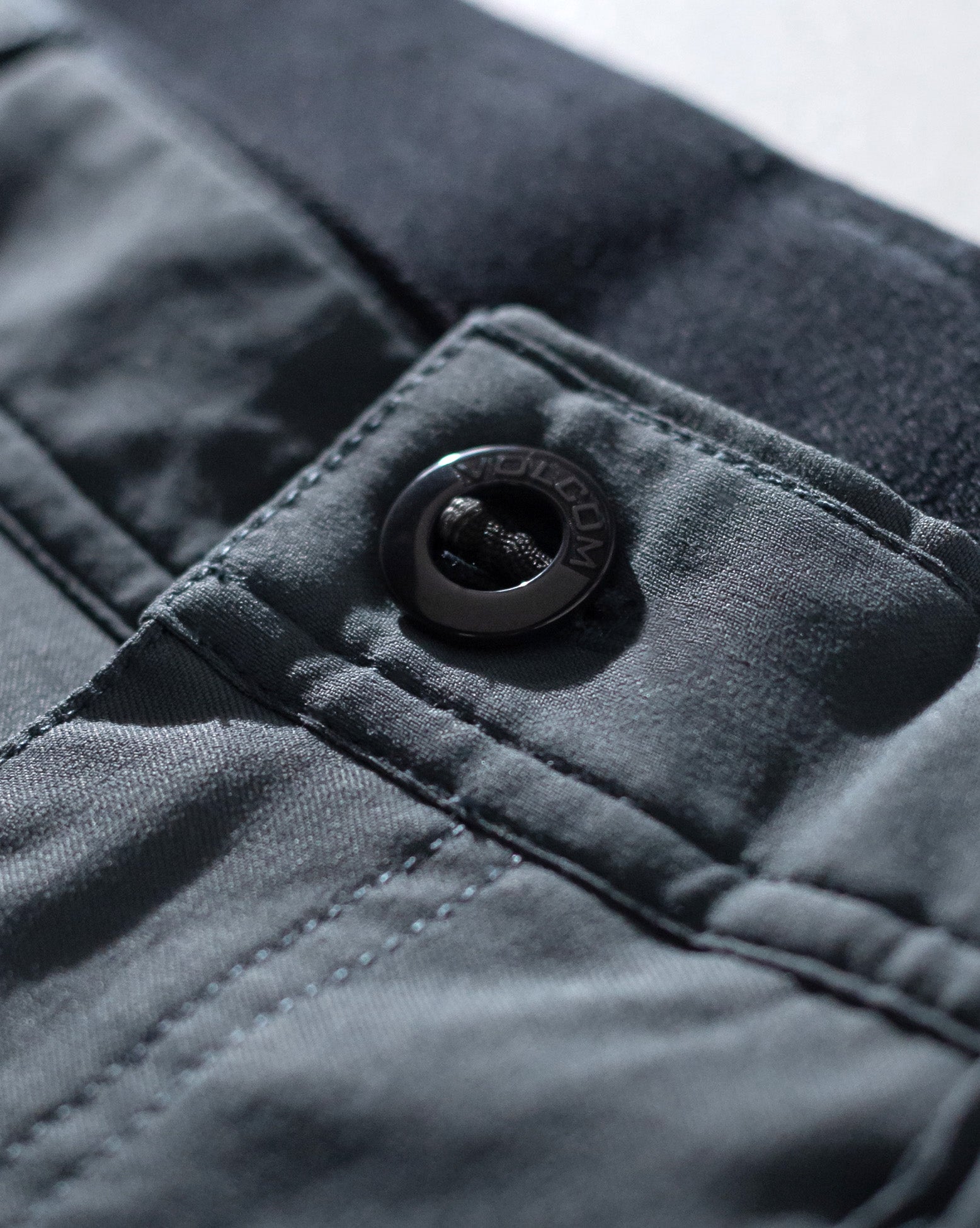 Calça Volcom Frickin Tech Chino Dark Slate. Possui 16” abertura de perna, múltiplos bolsos, botão indestrutível, pala traseira assimétrica, bordado Volcom Stone na perna, etiqueta Volcom no bolso traseiro e tecnologia V.Co-Tech™.