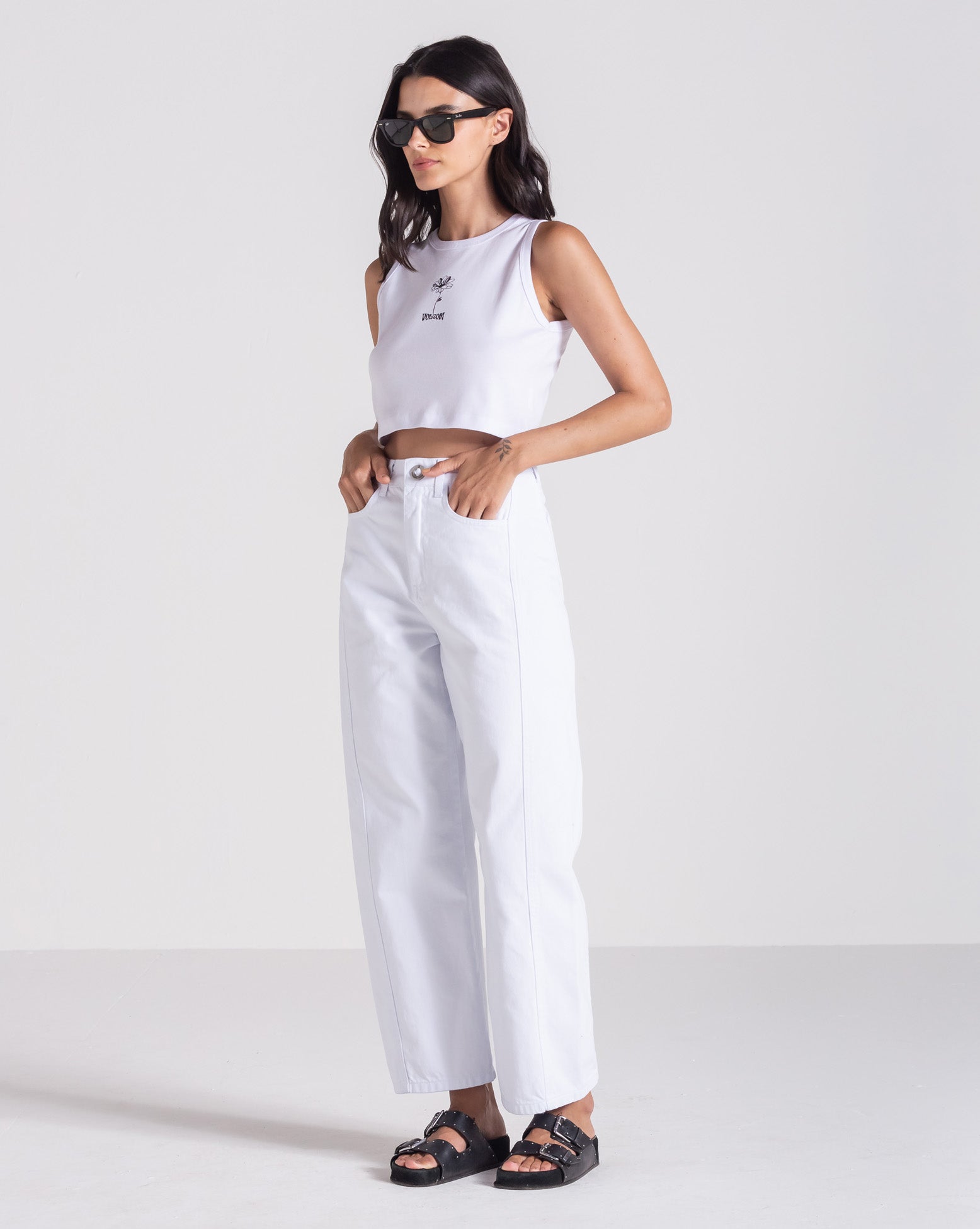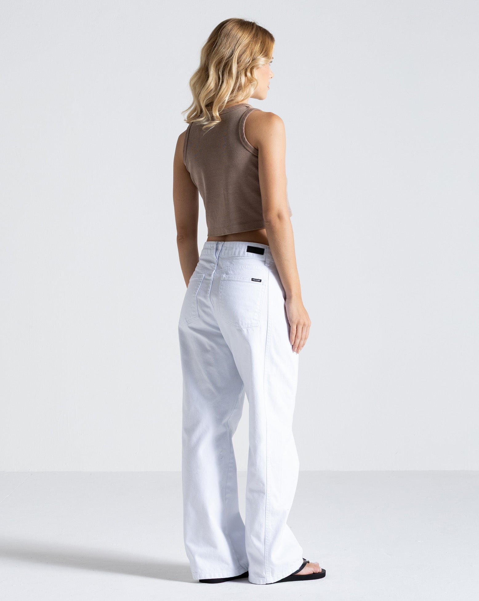 Calça Volcom Side Branca. Possui modelagem cintura alta reta, patch Volcom no cós traseiro, etiqueta Volcom no bolso, bordado Volcom Stone na perna e lavanderia amaciada.
