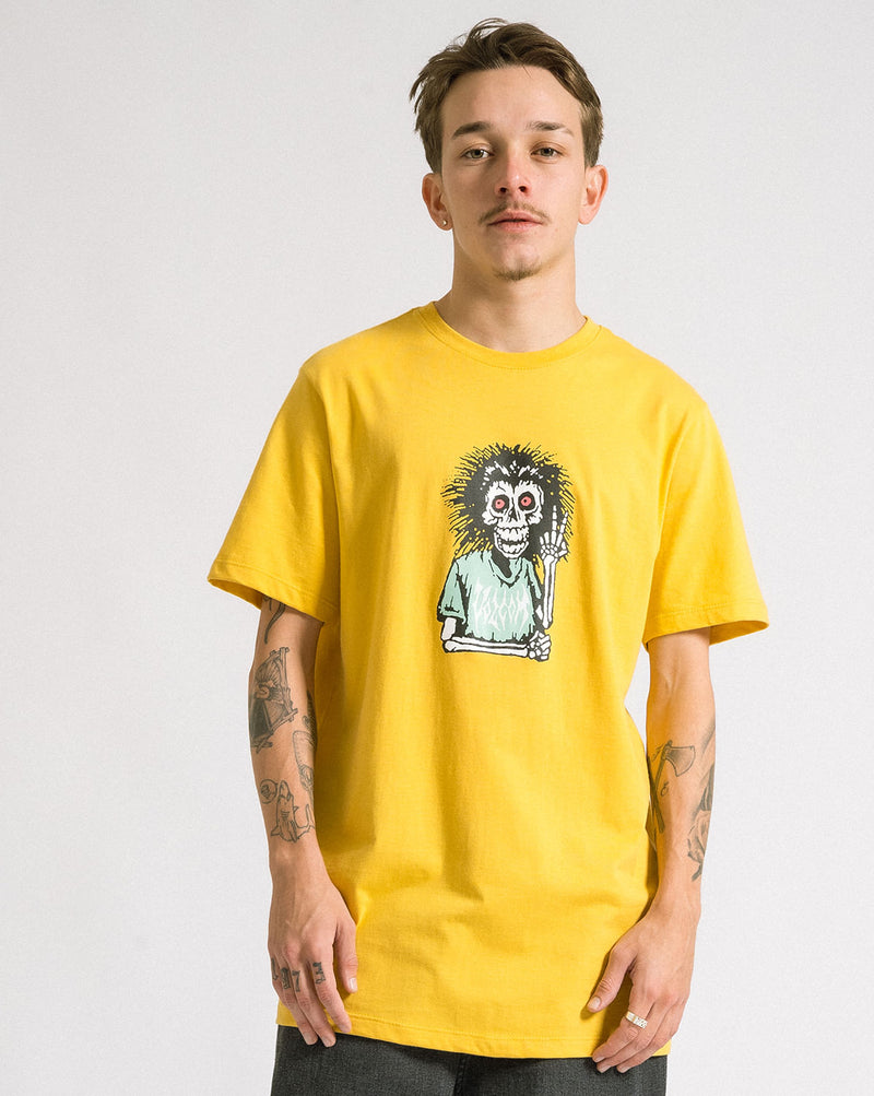Camiseta Volcom Slim Skunky. Possui modelagem slim, estampa em silk frontal, assinatura Volcom na manga, etiqueta Volcom na barra e viés contrastante.