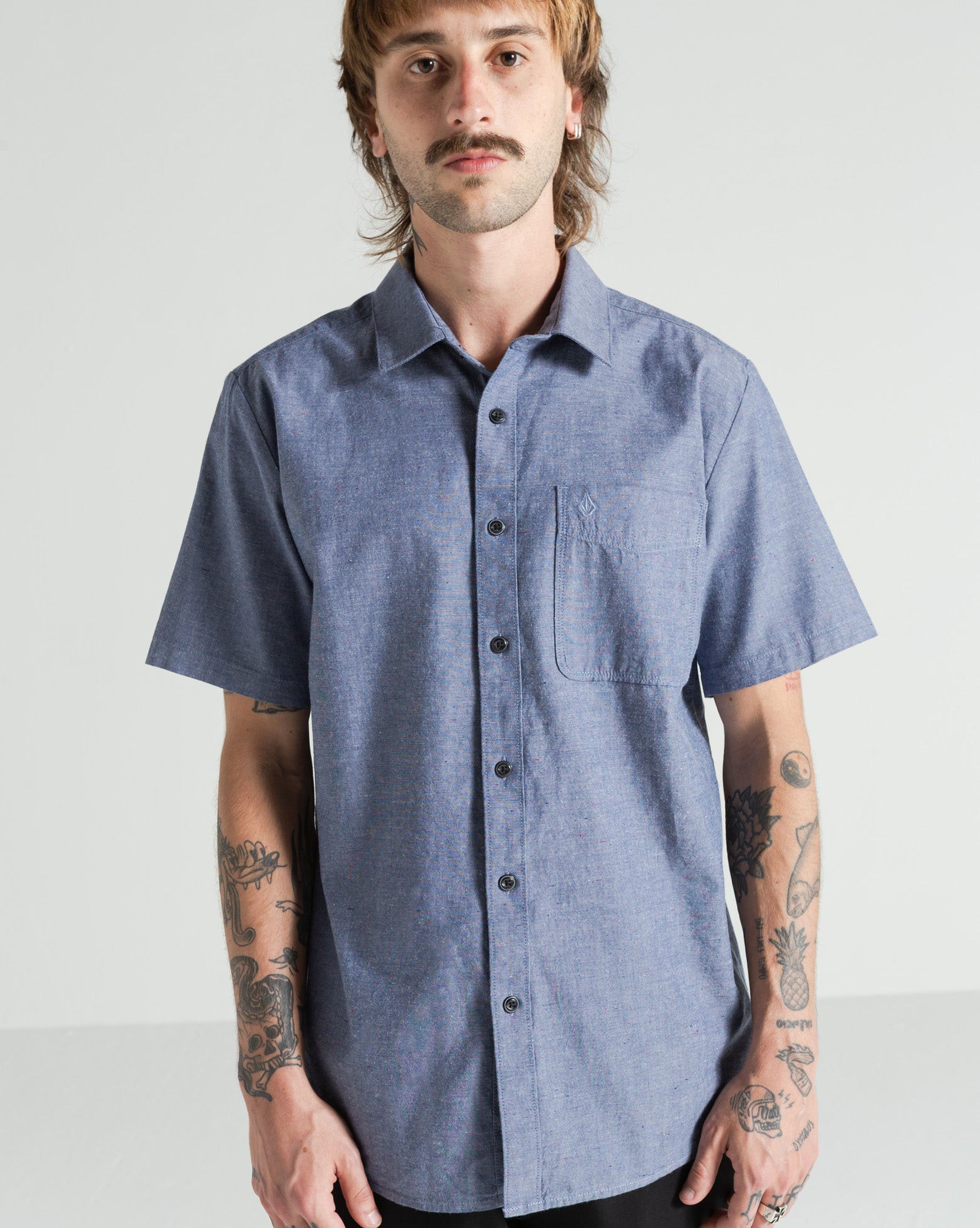 Camisa Volcom Date Knight Blue Wash. Possui modelagem classic, bordado Volcom Stone frontal, bolso frontal e botões personalizados.