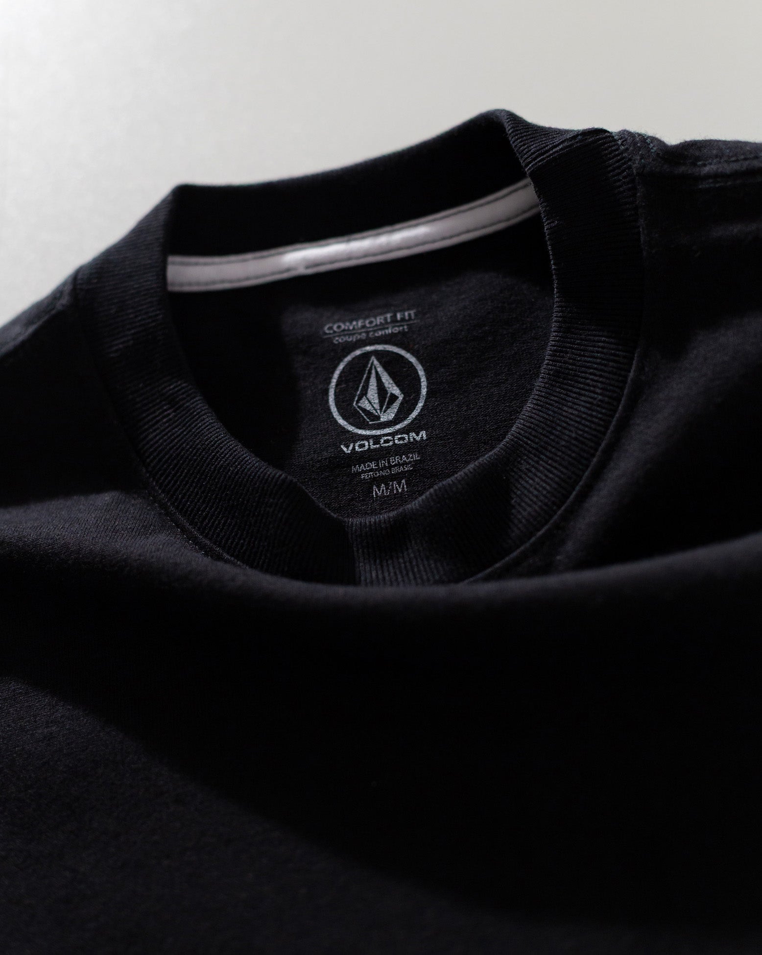Camiseta Comfort Fit Volcom Tumbled Preta. Possui modelagem comfort, gola de 3cm, silk frente e costas, assinatura Volcom na manga, etiqueta Volcom na barra, viés constrastante e tecido Heavy 250 g/m².