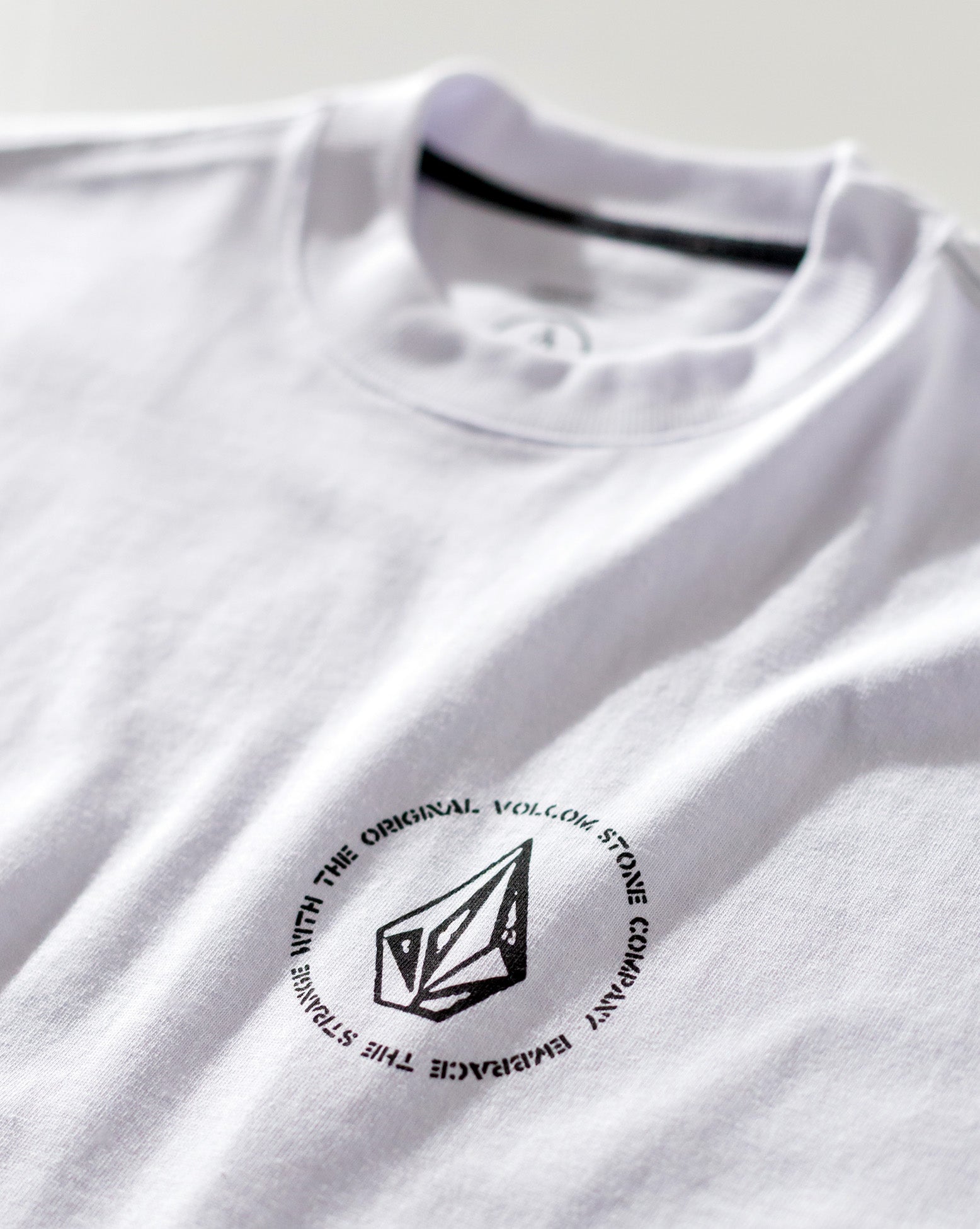 Camiseta Comfort Fit Volcom Classics Branca. Possui modelagem comfort, gola de 3cm, silk frontal, assinatura Volcom na manga, etiqueta Volcom na barra, viés constrastante e tecido Heavy 250 g/m².
