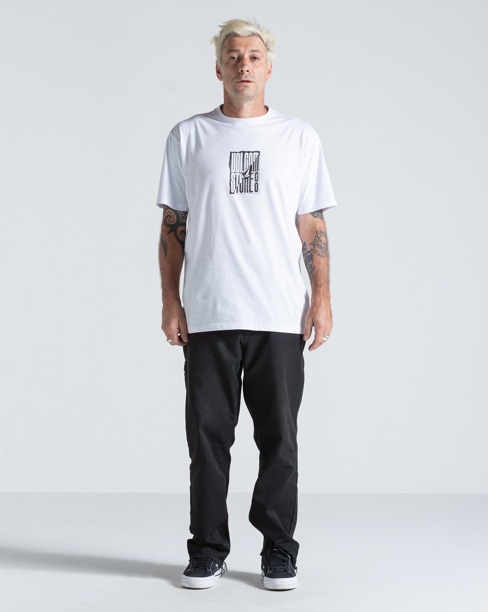 Camiseta Regular Volcom Exacto Branca. Possui modelagem regular, silk frontal, assinatura Volcom na manga e etiqueta interna.