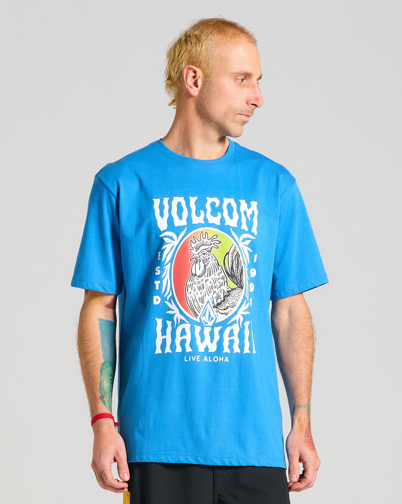 Camiseta Volcom Aloha Rooster. Parte da coleção Volcom Hawaii, possui modelagem regular, estampa em silk frontal, assinatura Volcom na manga, etiqueta interna e viés contrastante.
