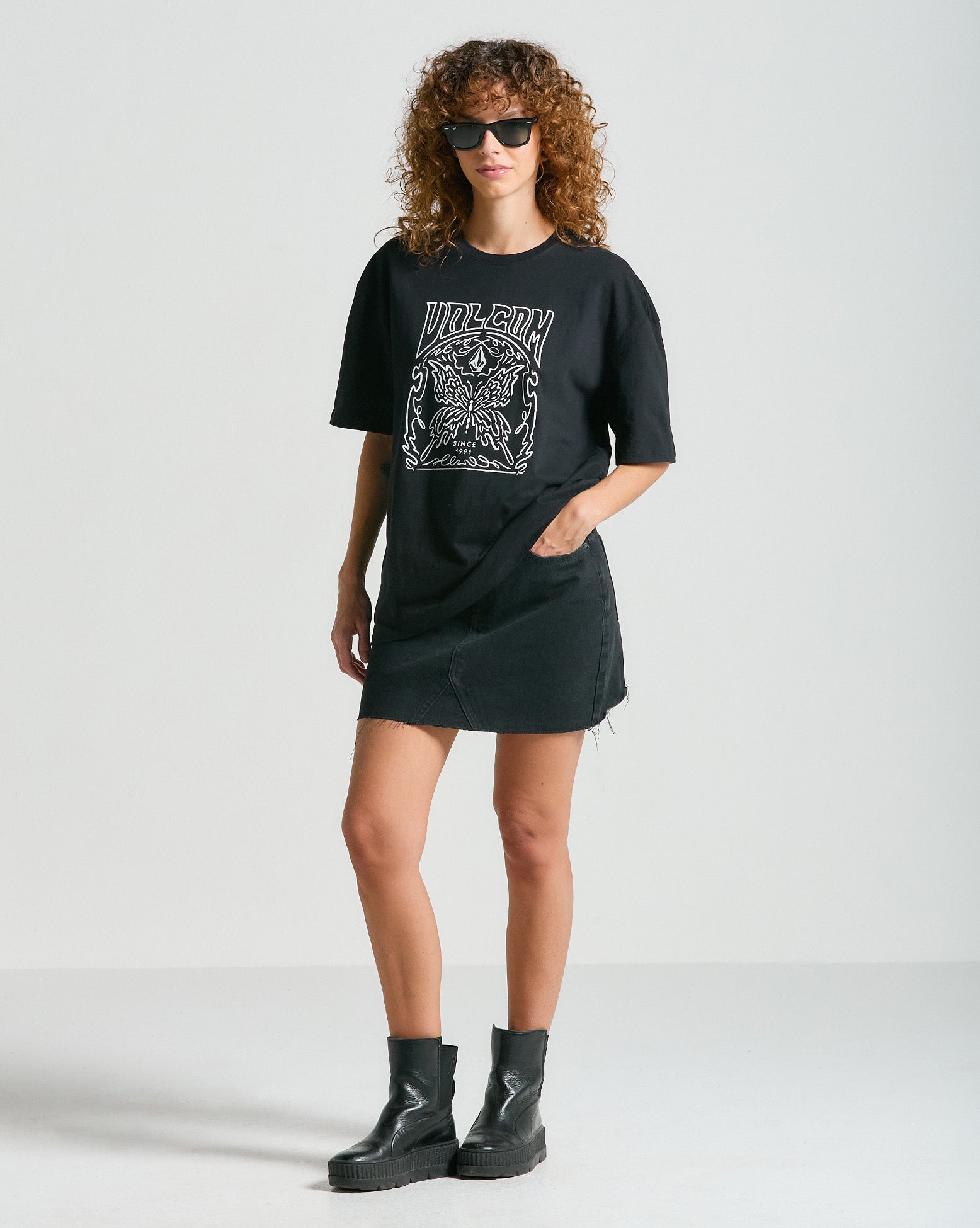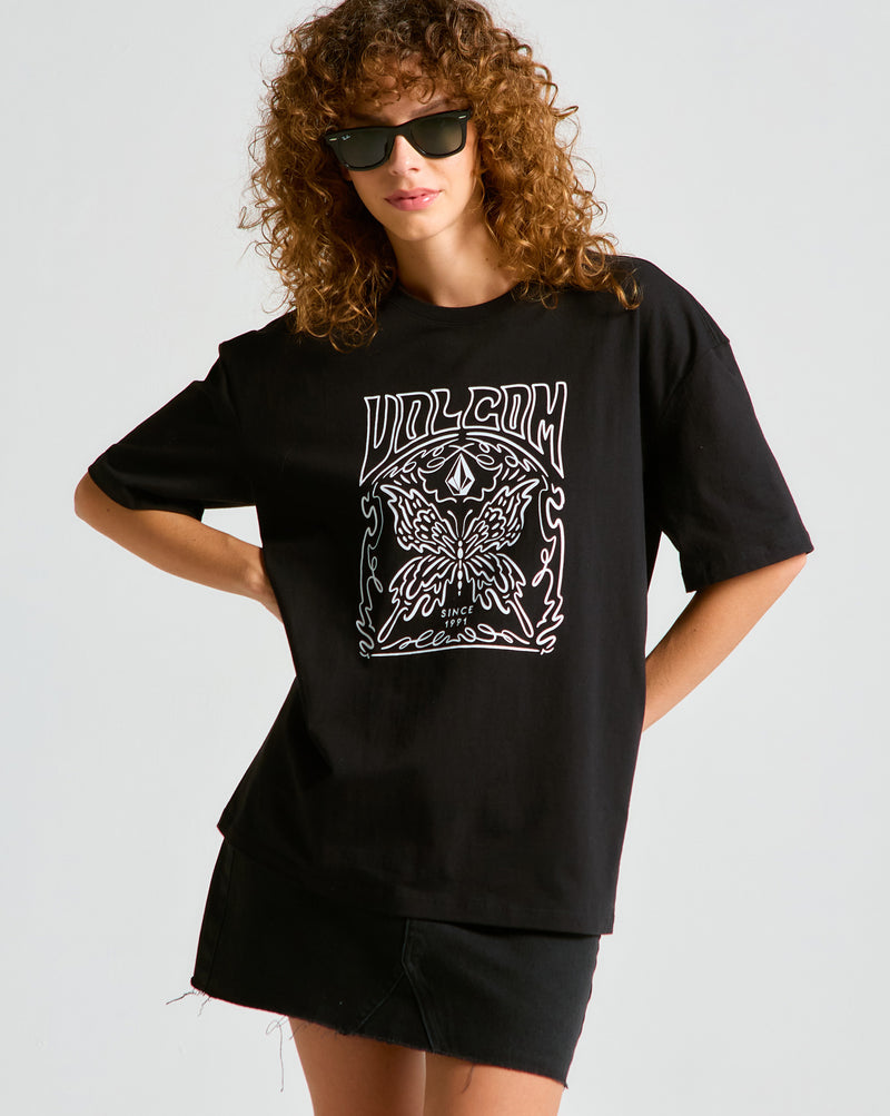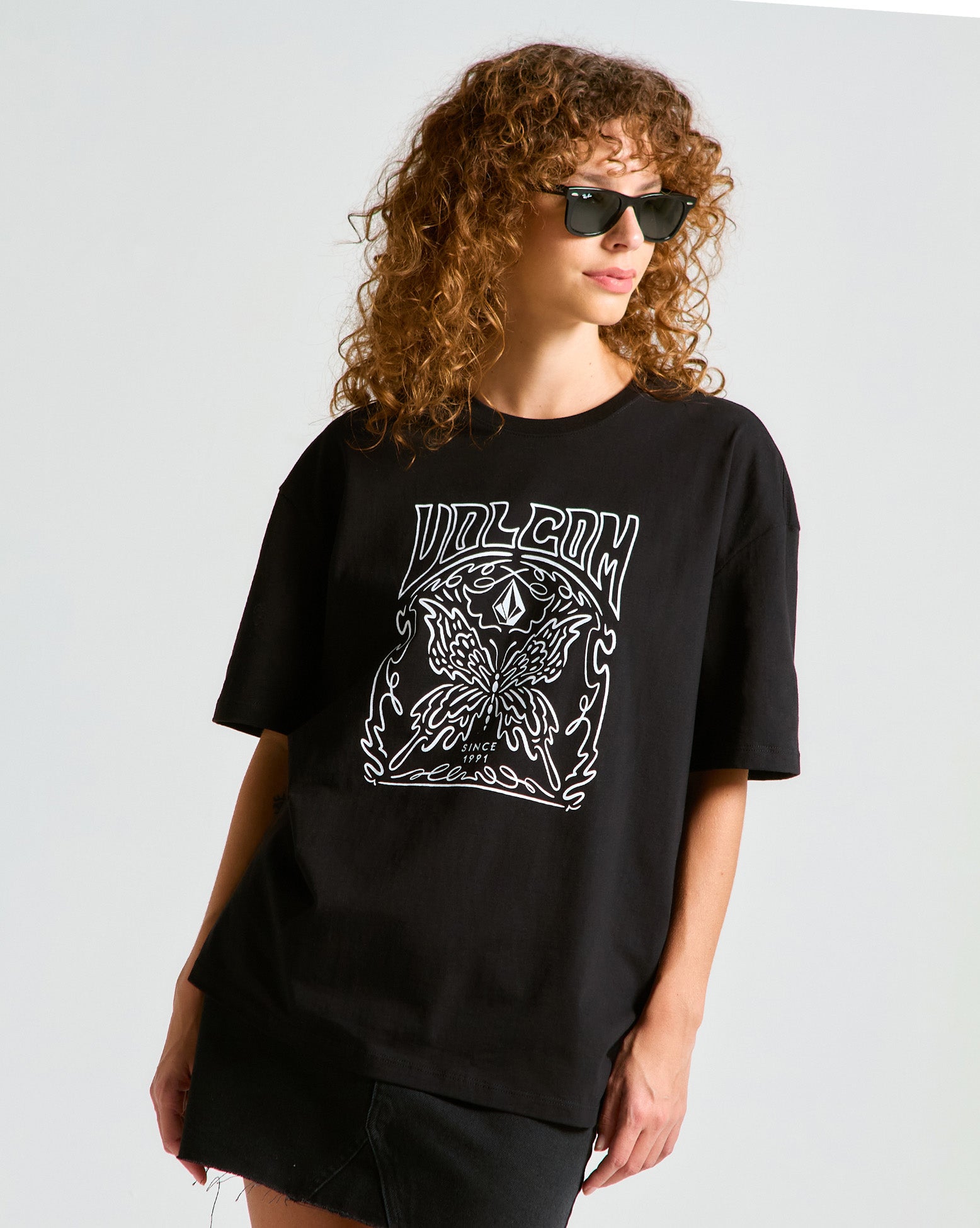 Camiseta Volcom Butterfly. Possui modelagem oversized e estampa em silk frontal.