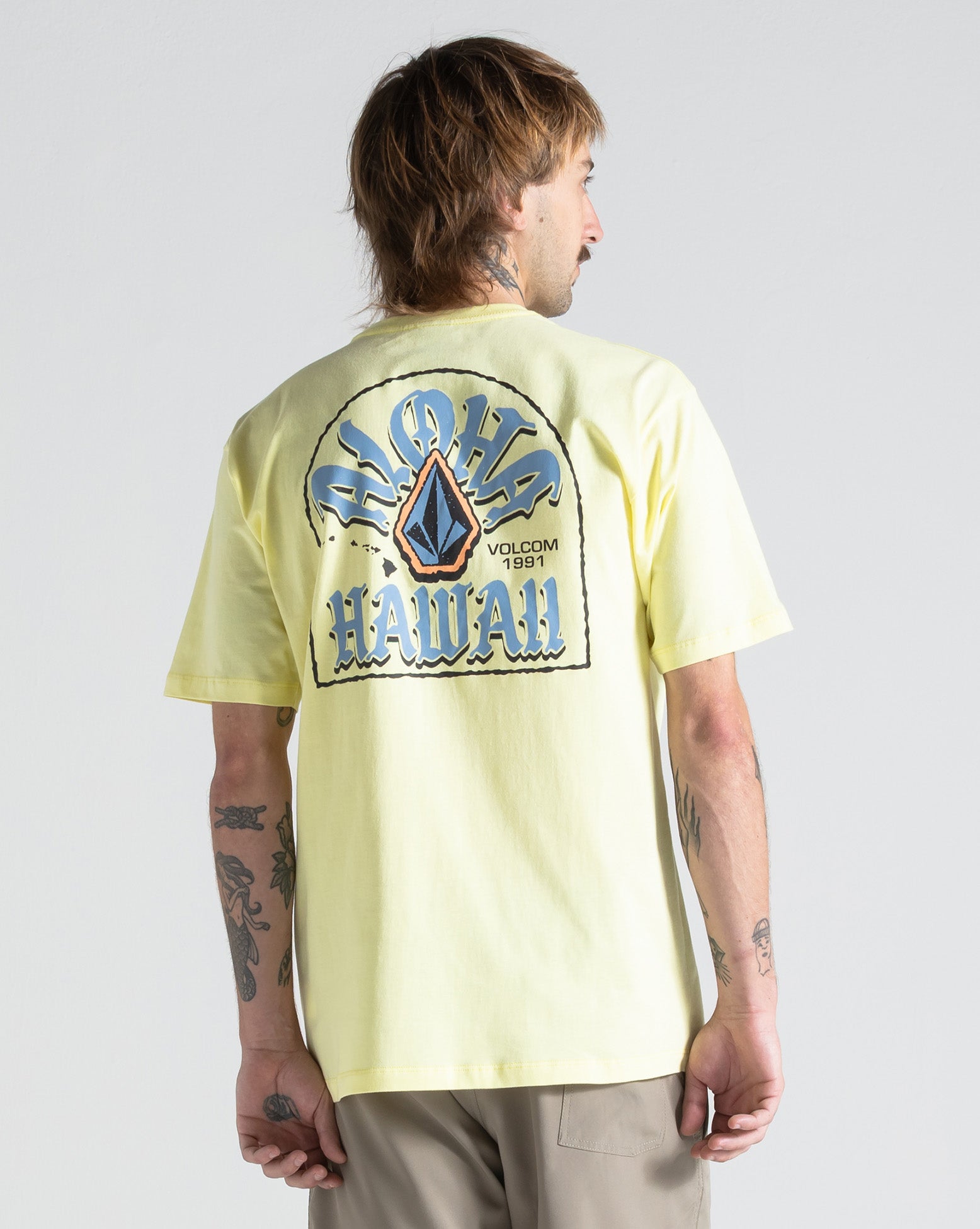 Camiseta Volcom Chandler Amarela. Possui modelagem regular, silk frente e costas, assinatura Volcom na manga, etiqueta interna e viés contrastante.
