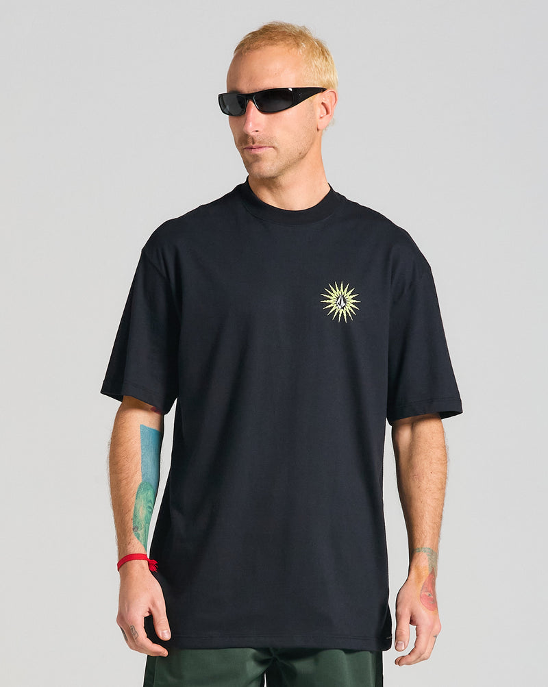 Camiseta Volcom Comfort Scorcho. Possui modelagem comfort, gola de 2,5cm, estampa em silk frontal e nas costas, assinatura Volcom na manga e etiqueta Volcom na barra.