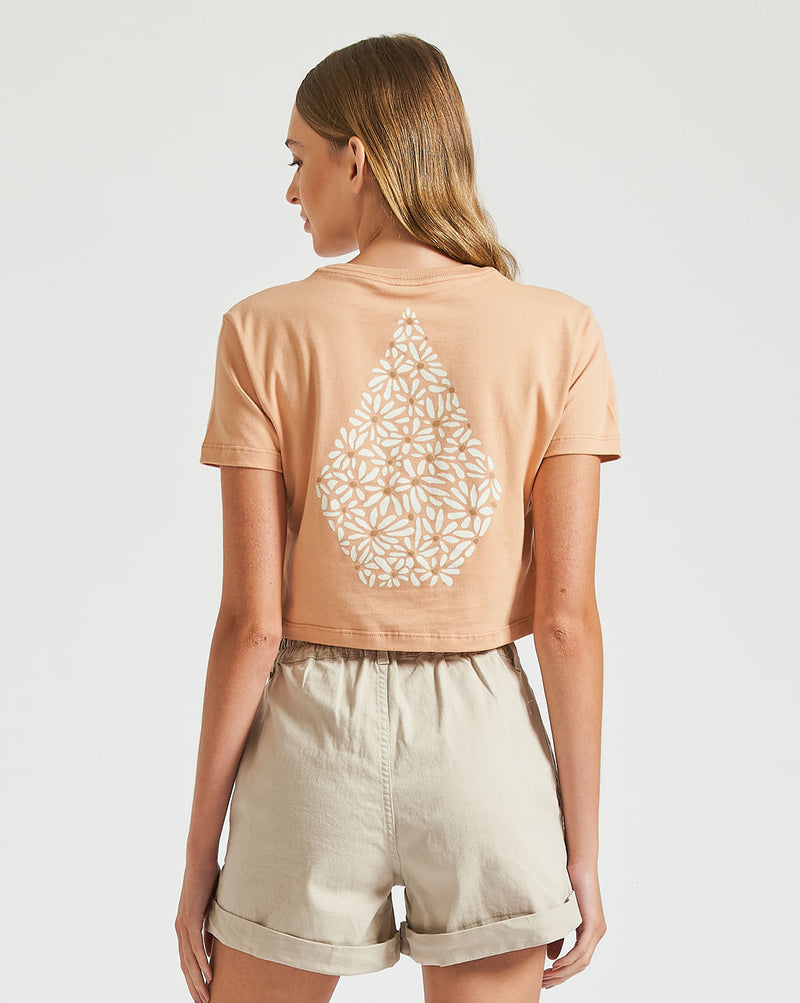 Camiseta Volcom Cropped Stone Daisy. Possui modelagem regular cropped e estampa em silk frontal e nas costas.