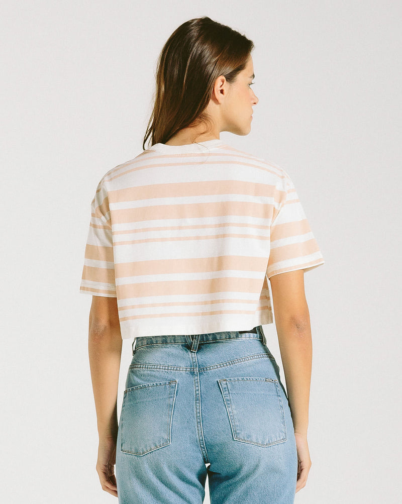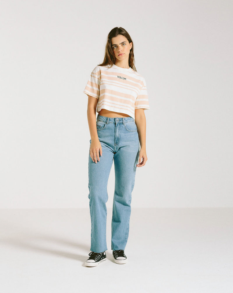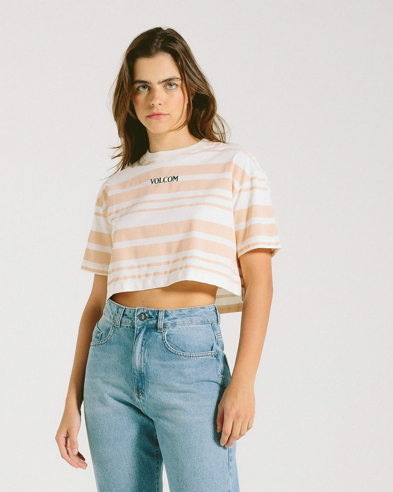 Camiseta Volcom Cropped Stripes. Possui modelagem relaxed cropped e bordado Volcom frontal.