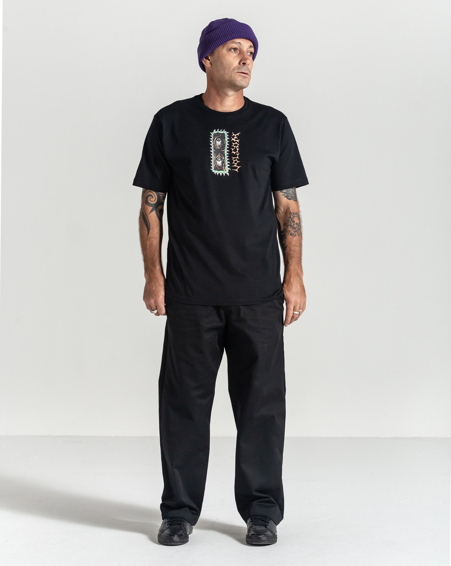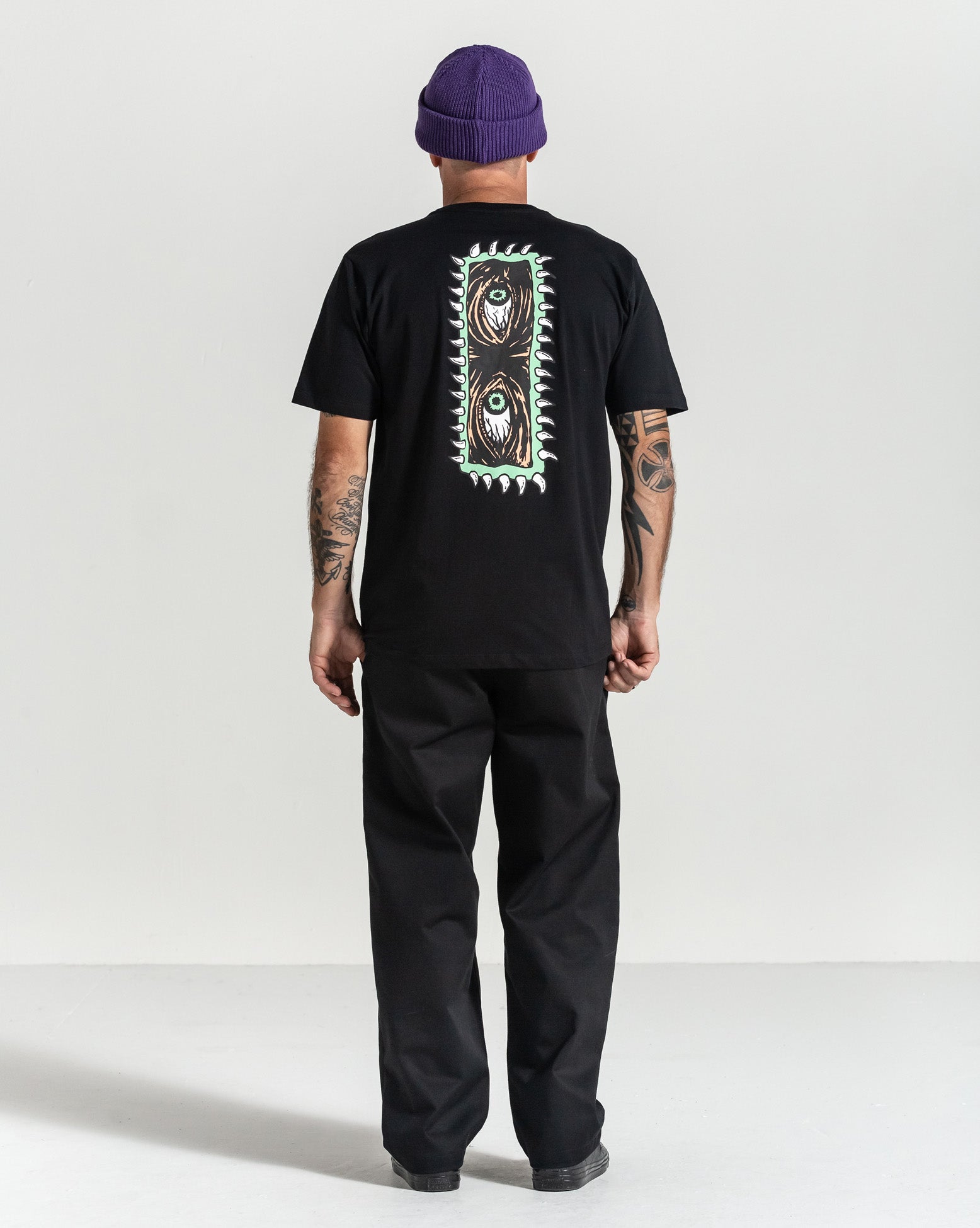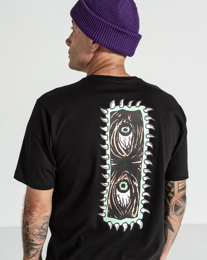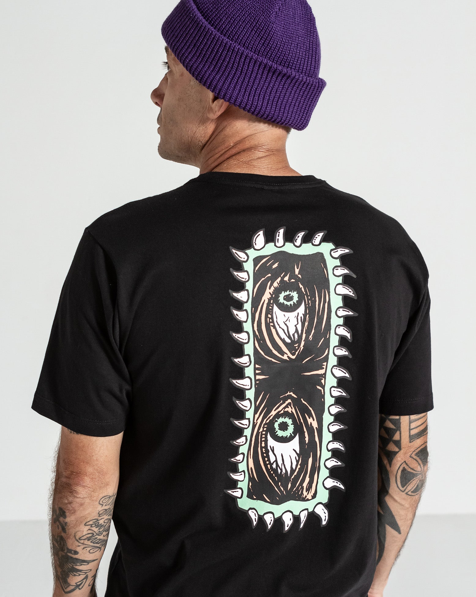 Camiseta Volcom Eye Rust. Possui modelagem regular, estampa em silk frontal e nas costas, assinatura Volcom na manga, etiqueta interna e viés contrastante.