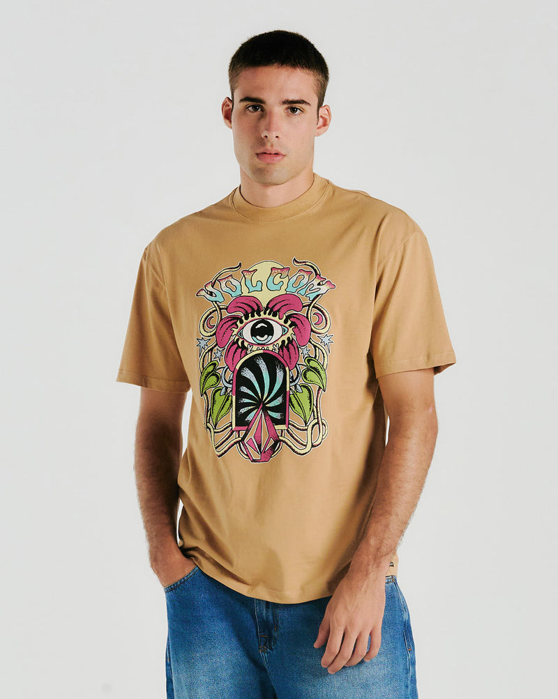 Camiseta Volcom Eye See You. Possui modelagem oversized, estampa em silk frontal, assinatura Volcom na manga, etiqueta Volcom na barra e viés contrastante.