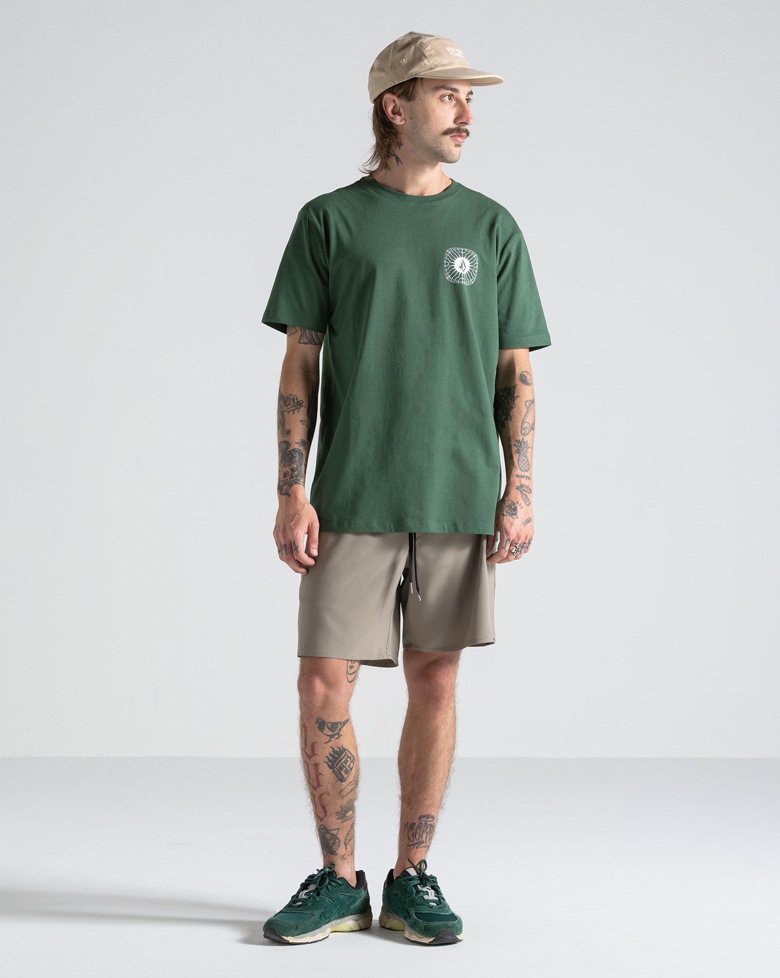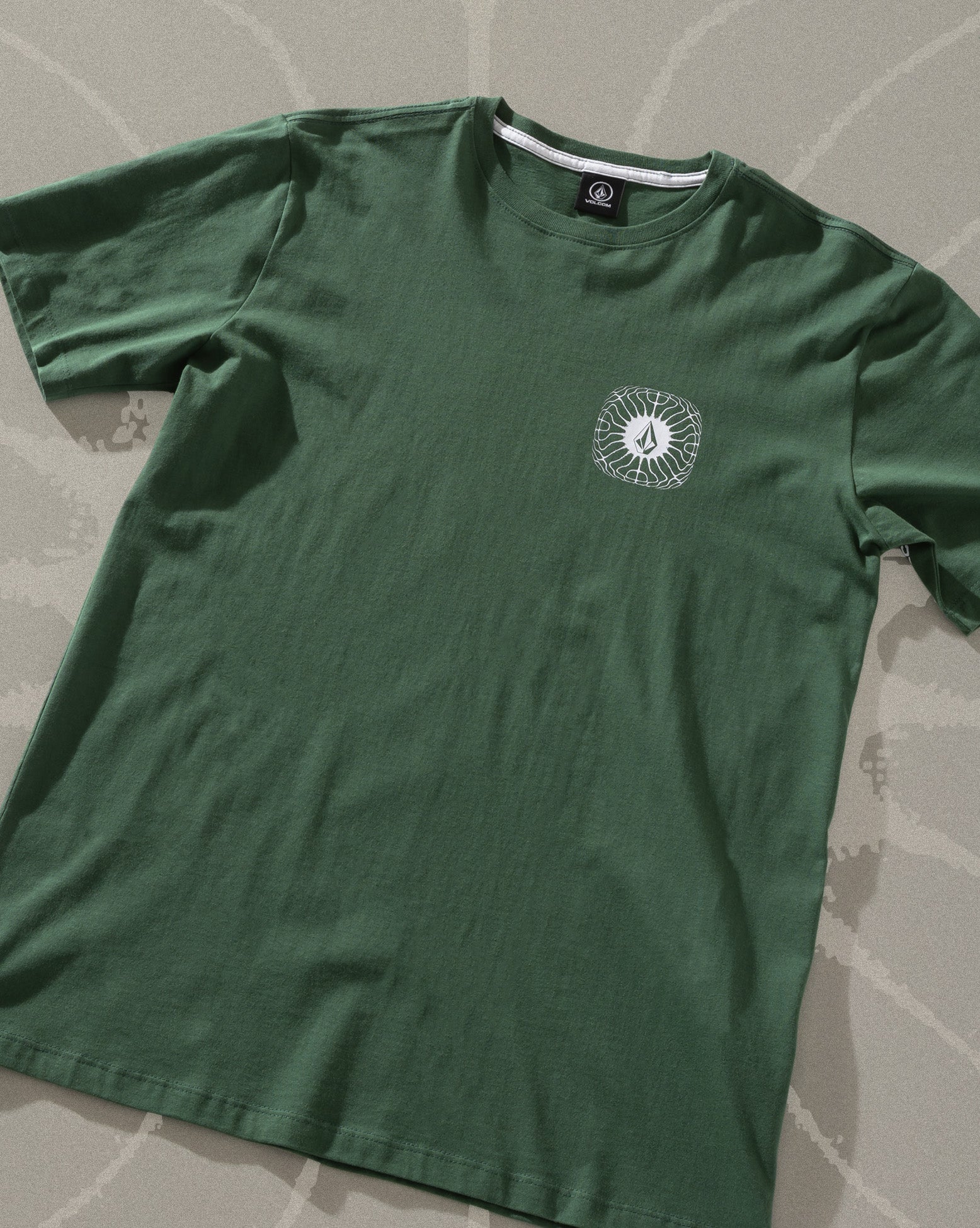 Camiseta Volcom Frequency Verde Escura. Possui modelagem regular, silk frente e costas, assinatura Volcom na manga, etiqueta interna e viés contrastante.
