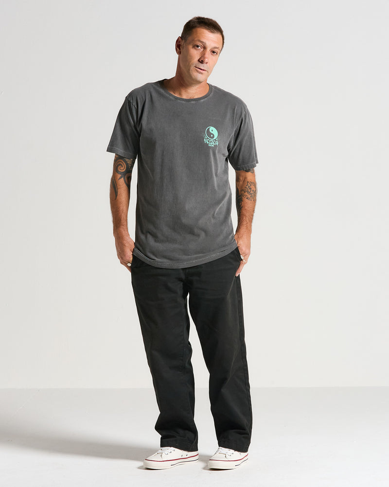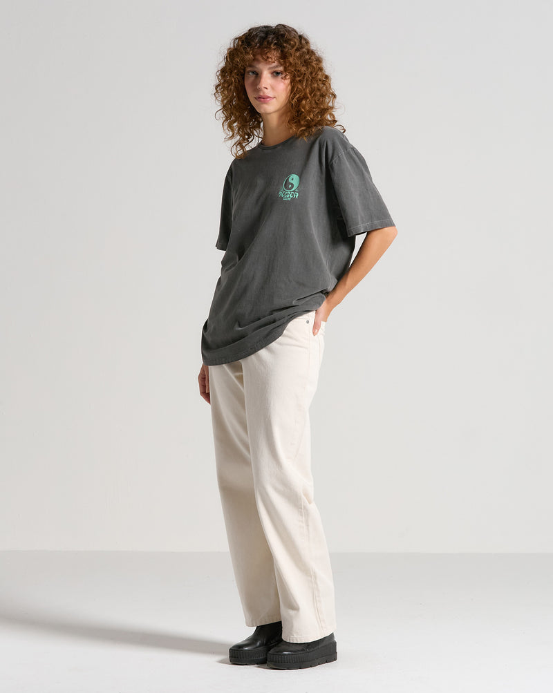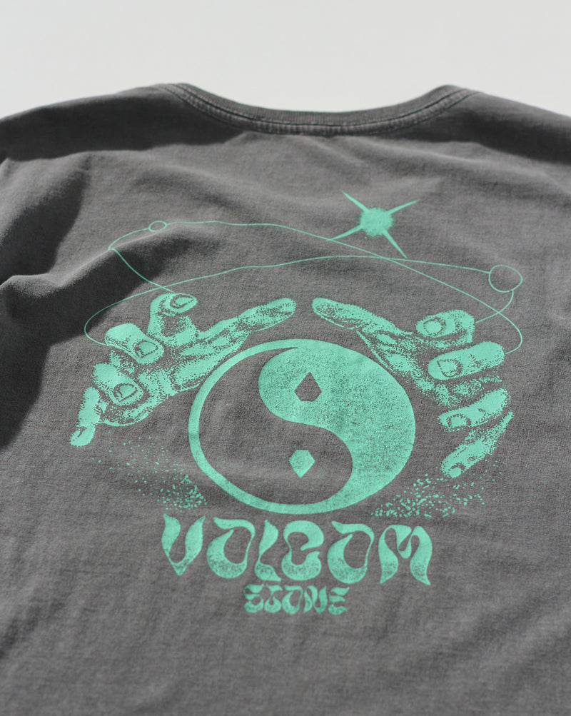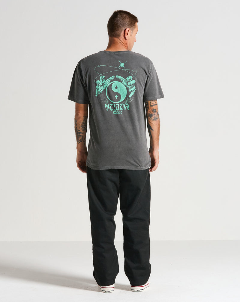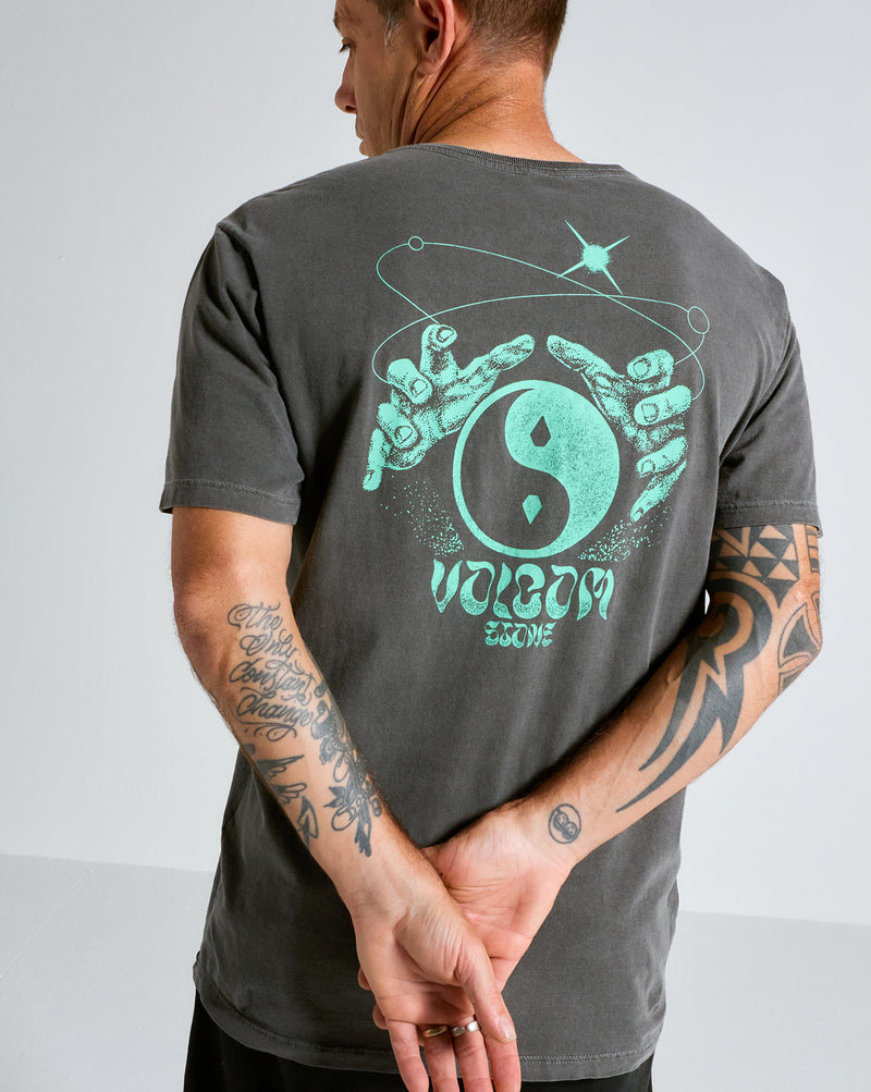 Camiseta Volcom Galacta. Possui modelagem regular, estampa em silk frontal e nas costas, lavanderia efeito estonado, viés interno do próprio tecido e etiqueta Volcom na barra.