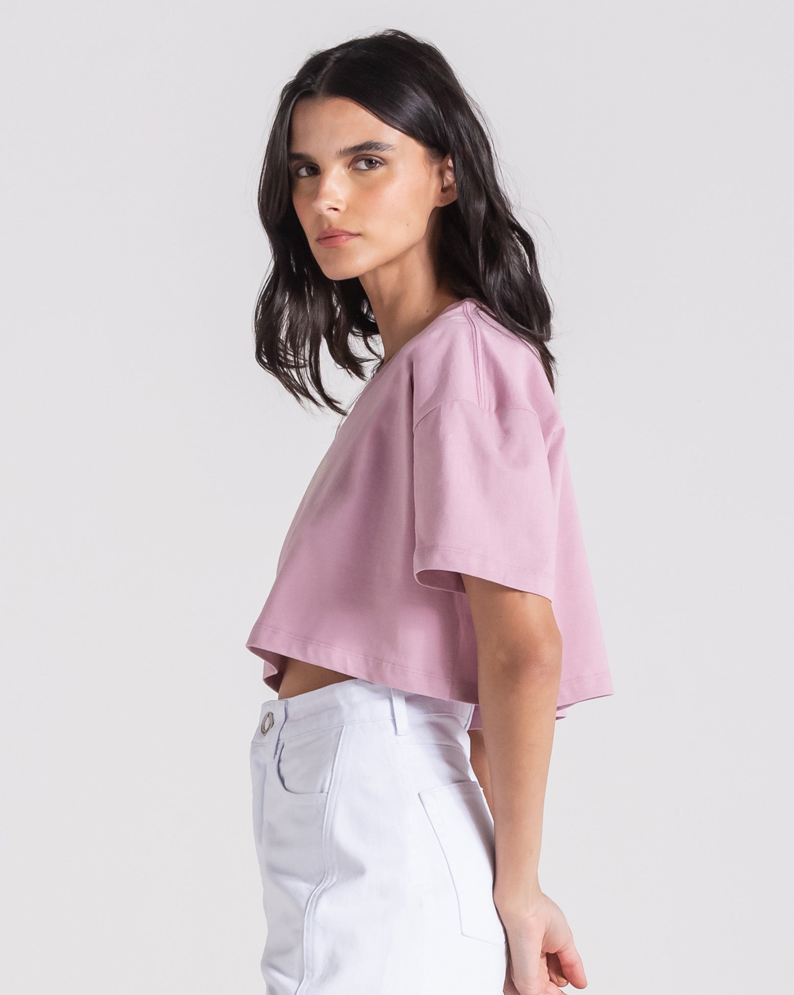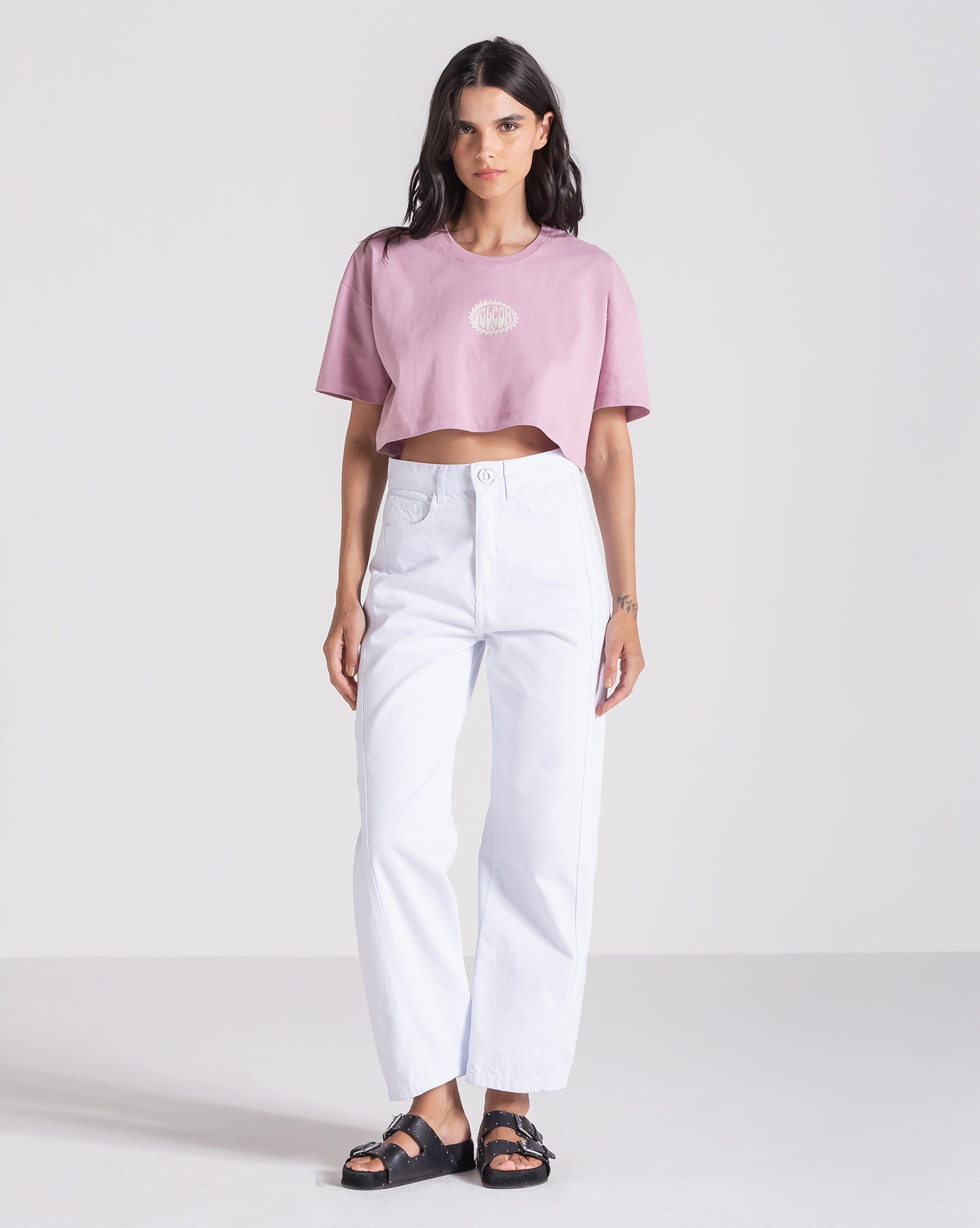 Camiseta Volcom Hang It Up. Modelagem cropped oversized, estampa em silk frontal e costura do ombro deslocada.
