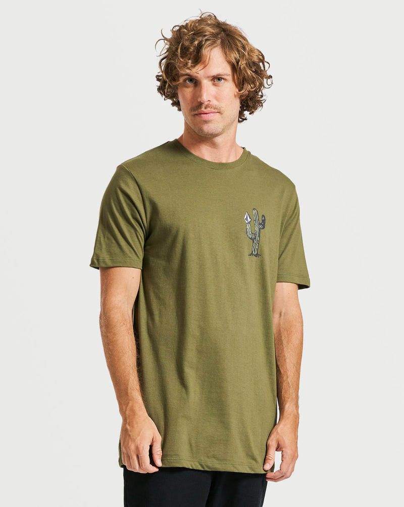 Camiseta Volcom Long Fit Prickly. Possui modelagem long fit, estampa em silk frontal e nas costas, assinatura Volcom na manga e viés contrastante. Disponível nas cores branco, off white e militar.