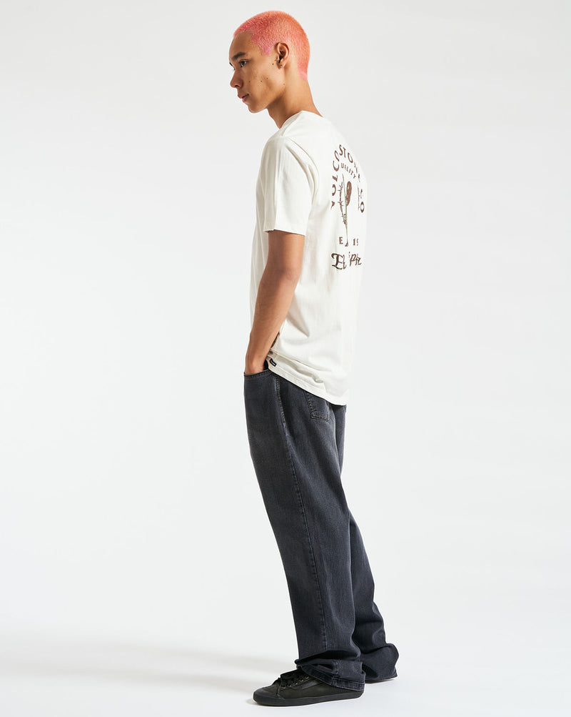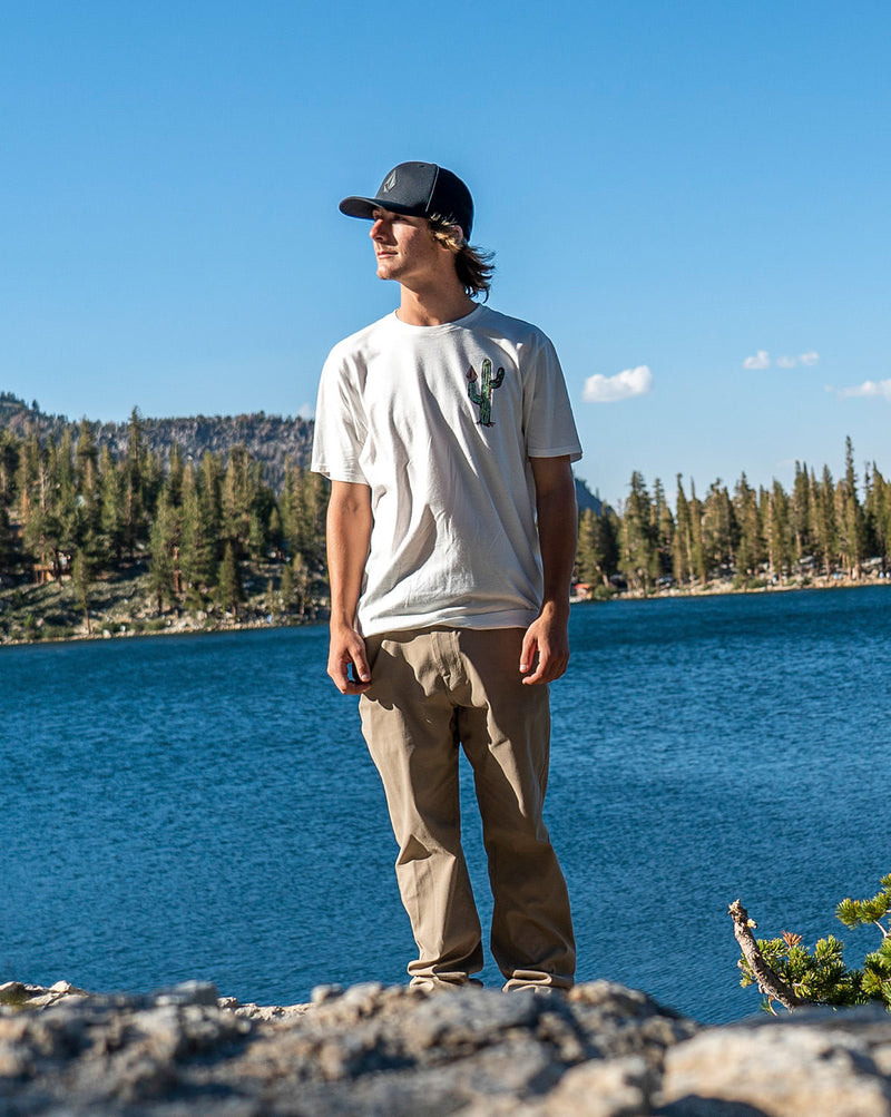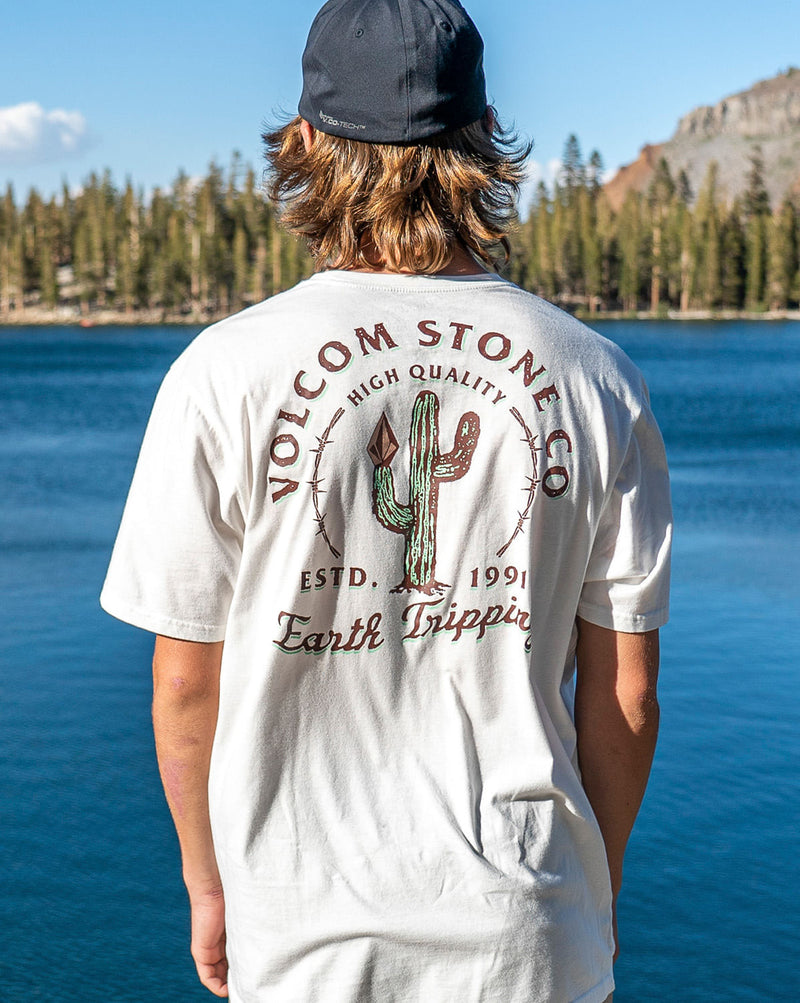 Camiseta Volcom Long Fit Prickly. Possui modelagem long fit, estampa em silk frontal e nas costas, assinatura Volcom na manga e viés contrastante. Disponível nas cores branco, off white e militar.