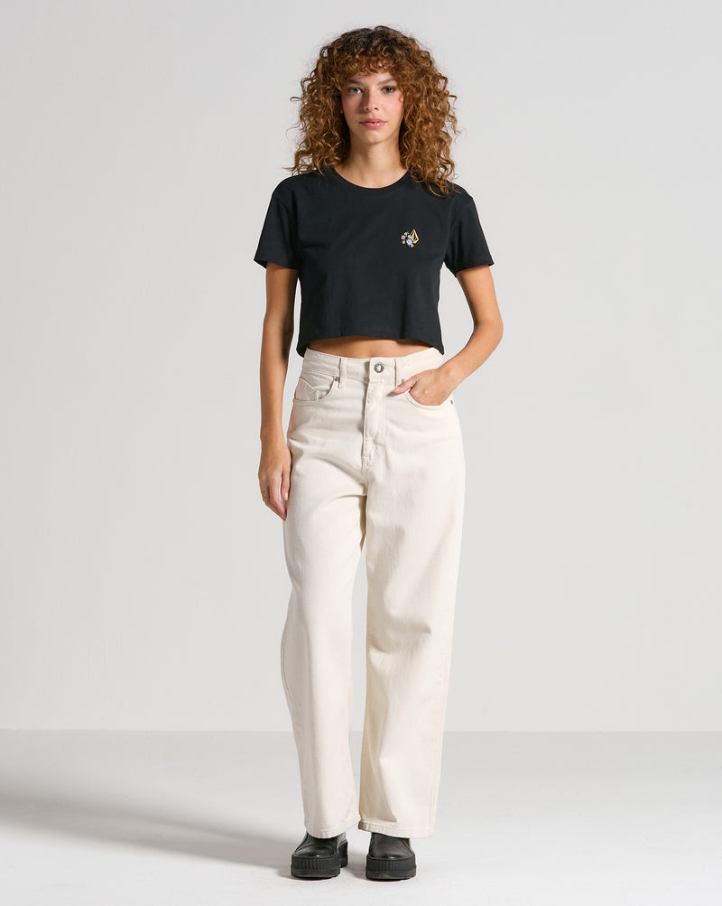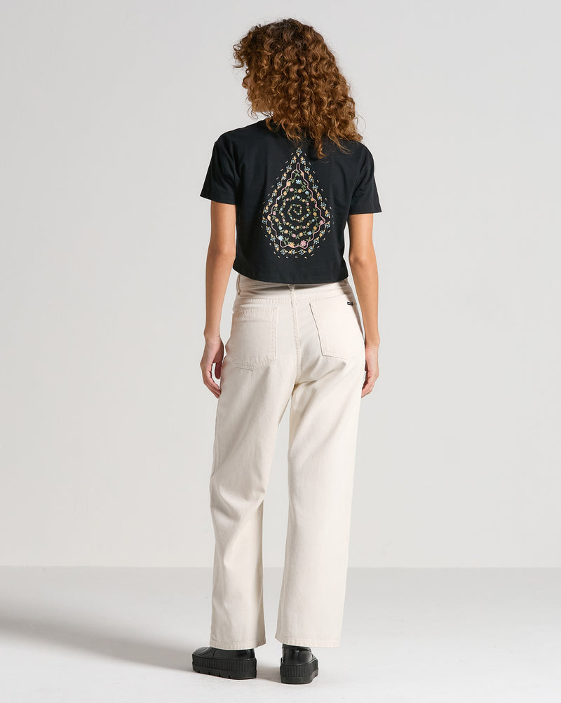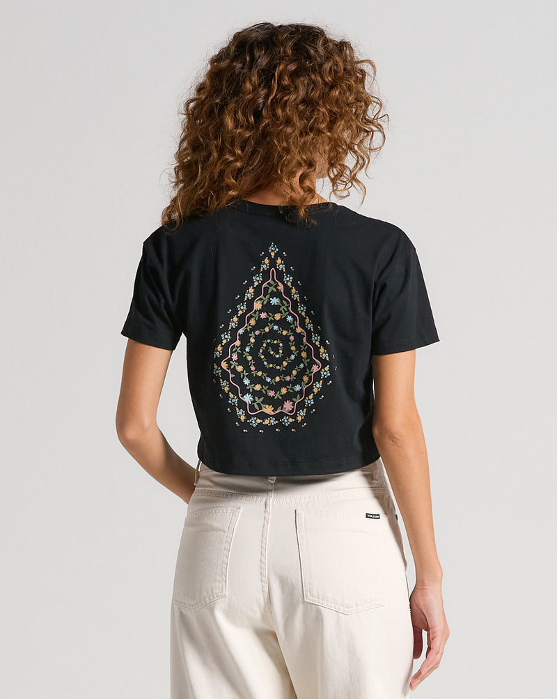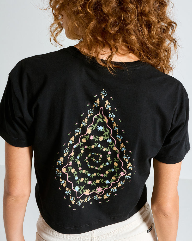 Camiseta Volcom Maze. Possui modelagem cropped e estampa em silk frontal e nas costas.