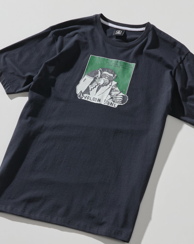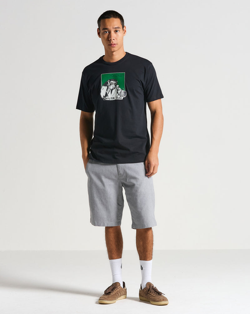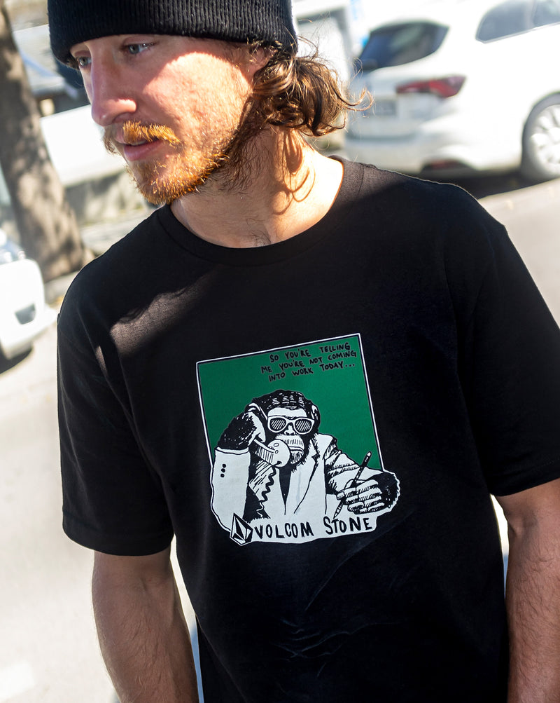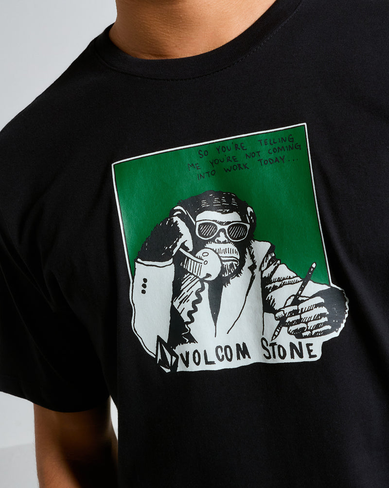 Camiseta Volcom Monkey Biz. Possui modelagem regular, estampa em silk frontal, assinatura Volcom na manga, etiqueta interna e viés contrastante.