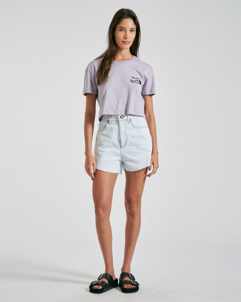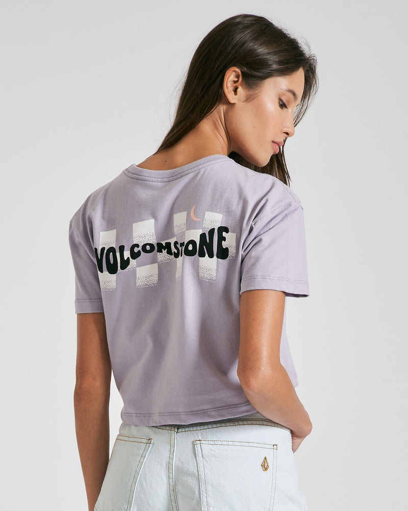 Camiseta Volcom Night Out. Possui modelagem cropped e estampa em silk frontal e nas costas.