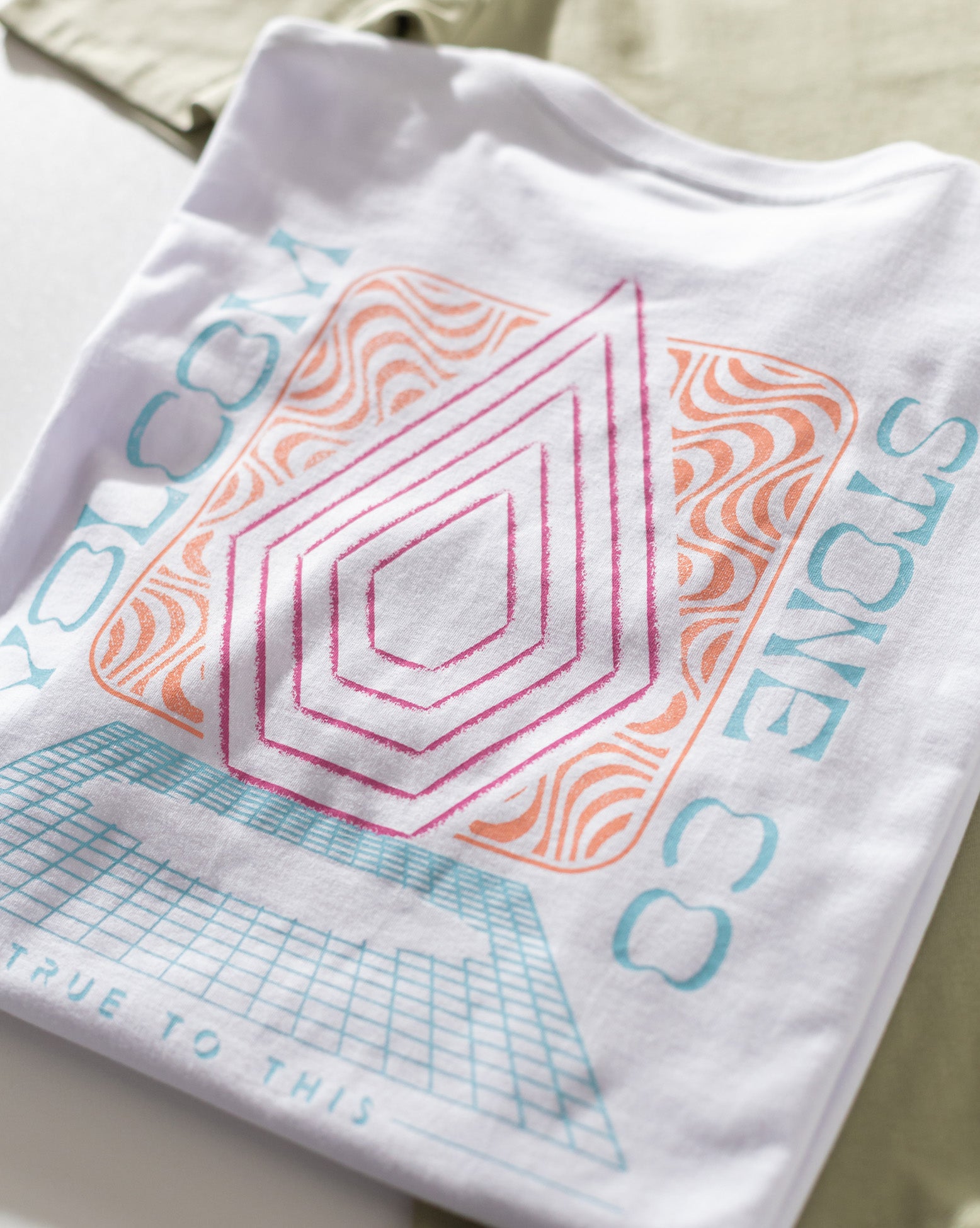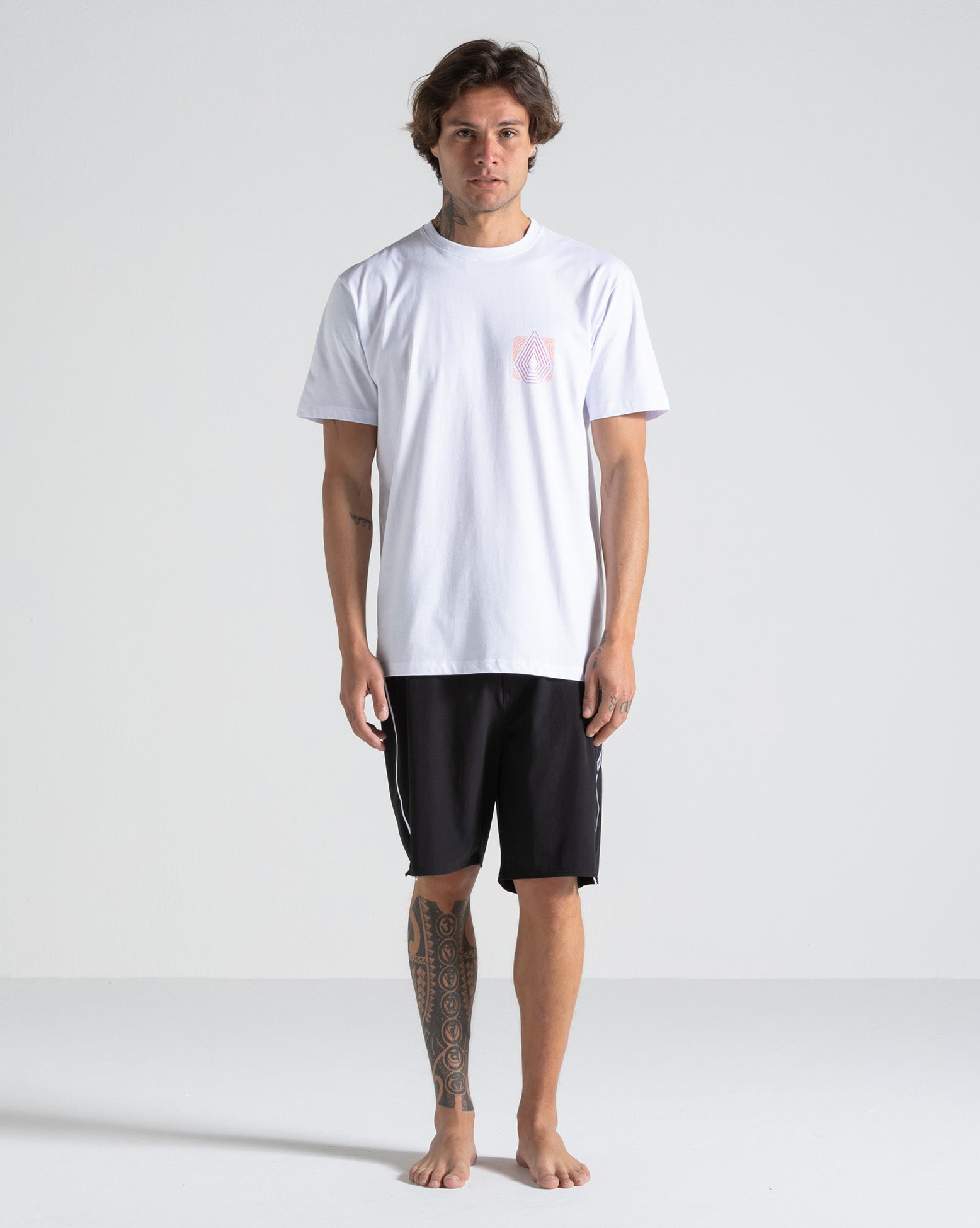 Camiseta Volcom Plated Branca. Possui modelagem regular, silk frente e costas, assinatura Volcom na manga, etiqueta interna e viés contrastante.