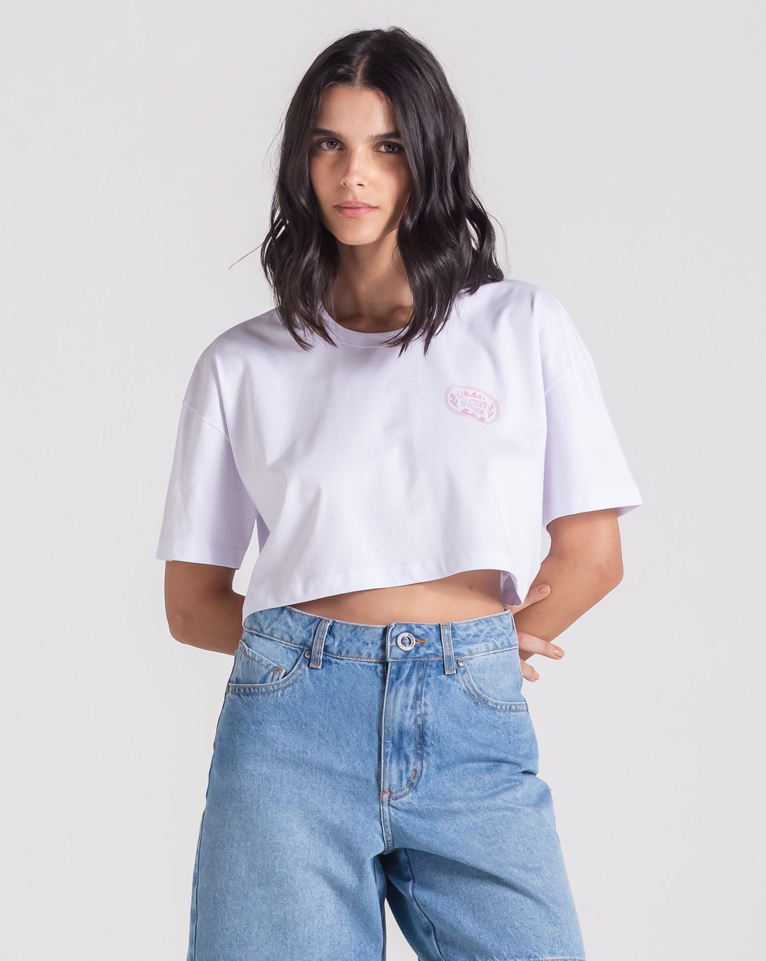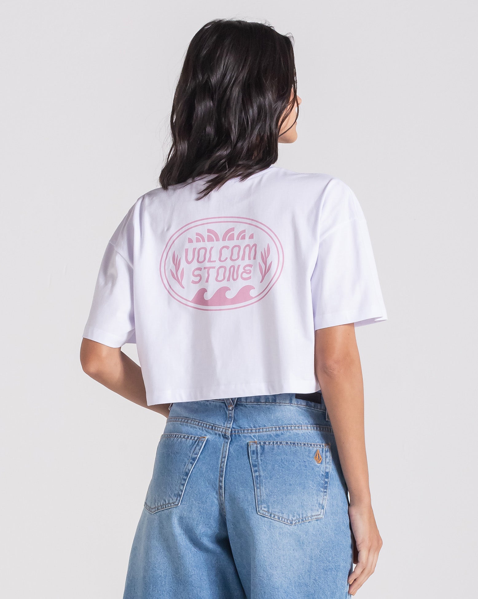 Camiseta Volcom Pocket Dial Branca. Modelagem cropped oversized, estampa em silk frontal e nas costas e costura do ombro deslocada.