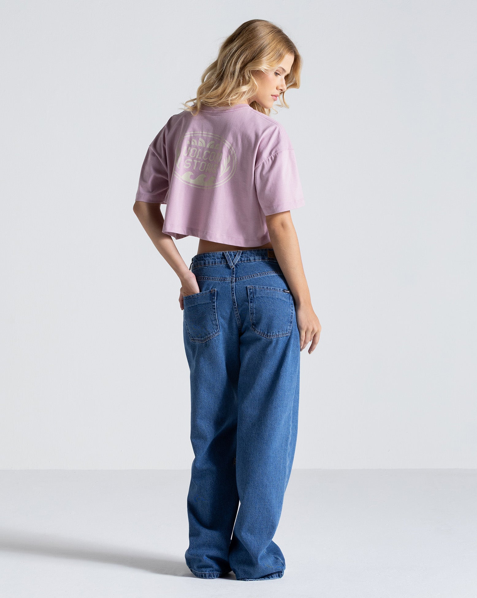 Camiseta Volcom Pocket Dial Rosa. Modelagem cropped oversized, estampa em silk frontal e nas costas e costura do ombro deslocada.