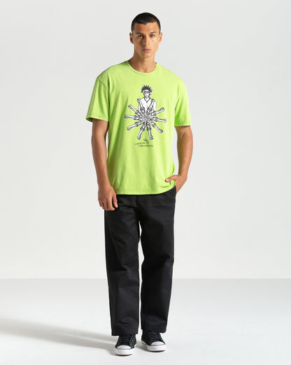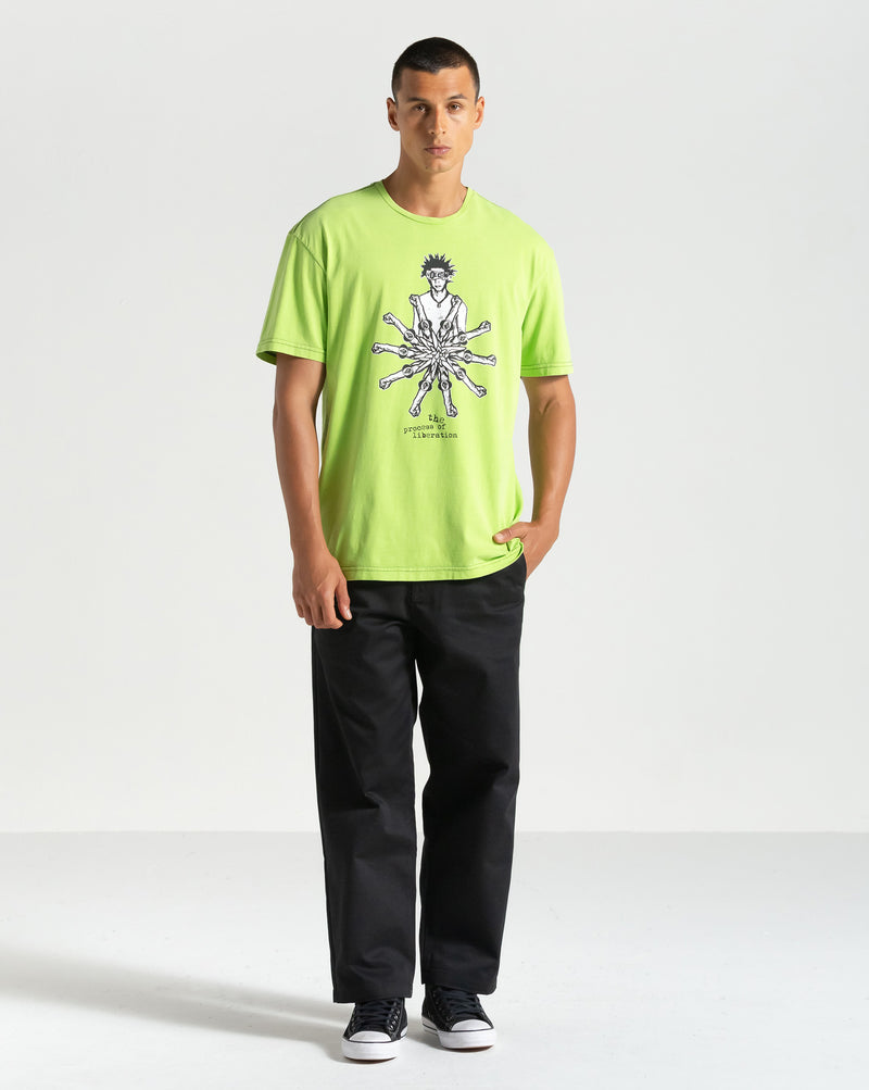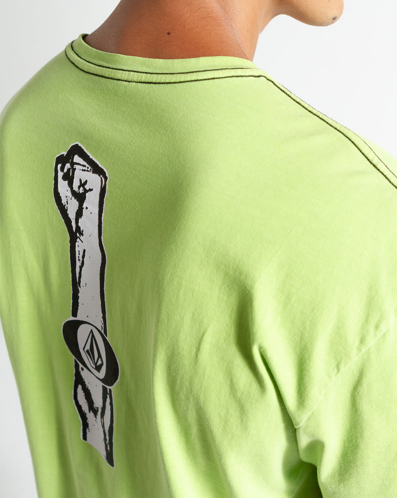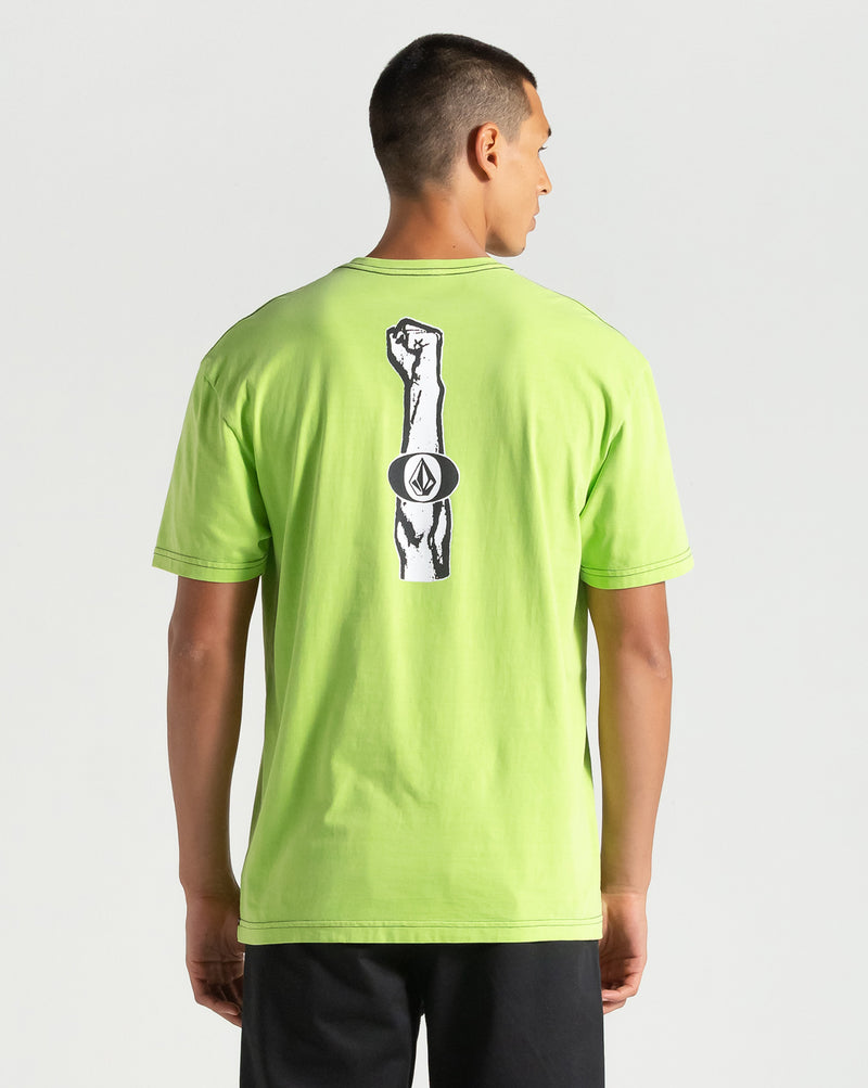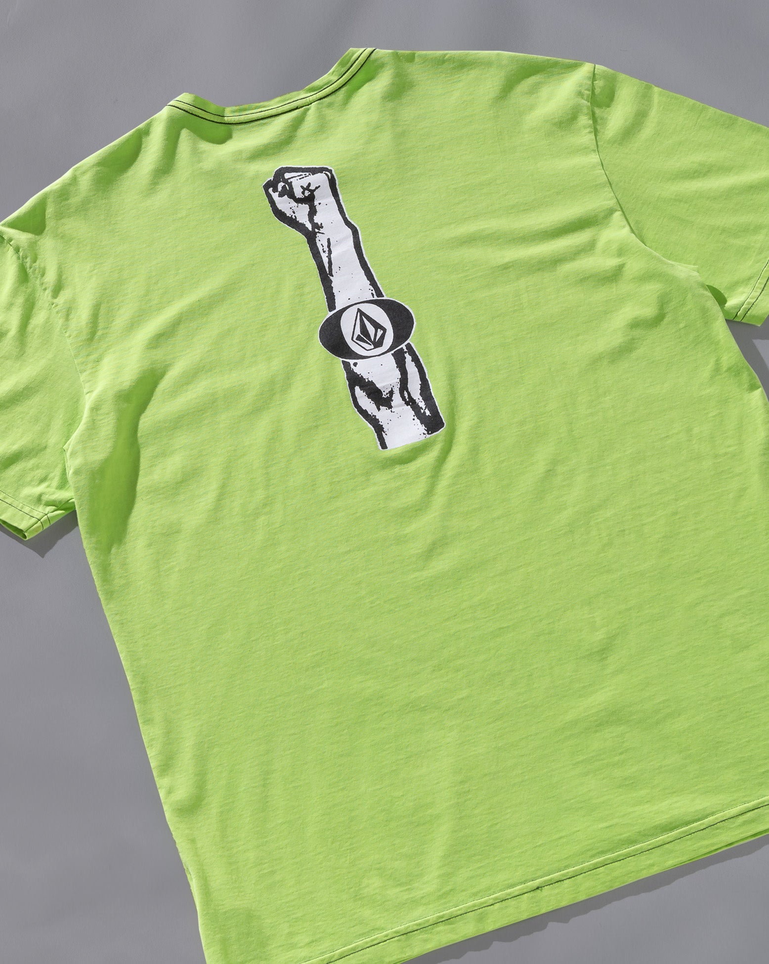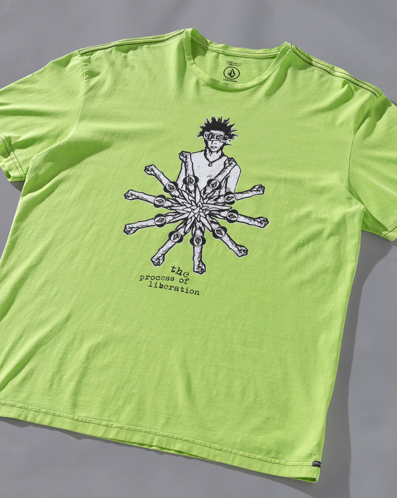 Camiseta Volcom Process. Possui modelagem regular, estampa em silk frontal e nas costas, lavanderia efeito estonado, costura contrastante e viés interno do próprio tecido.