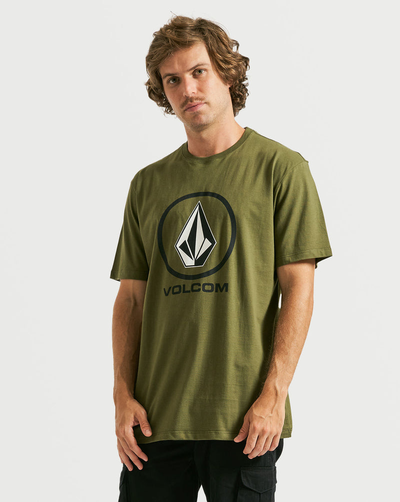 Camiseta Volcom Regular Crisp Stone. Possui modelagem regular, estampa em silk frontal, assinatura Volcom na manga e viés contrastante. Disponível nas cores branco, amarelo, cinza e militar.