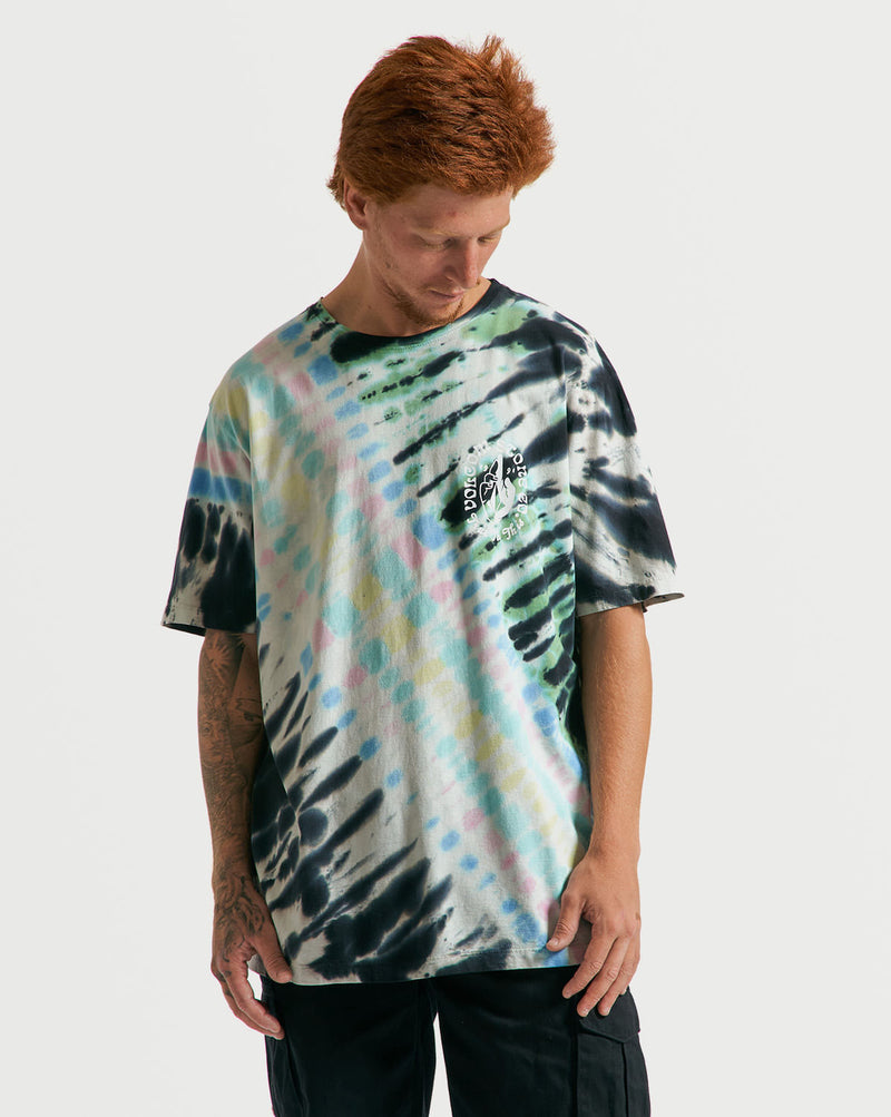 Camiseta Volcom Regular Gleaming. Possui modelagem regular, estampa em silk frontal e lavanderia efeito tie dye.
