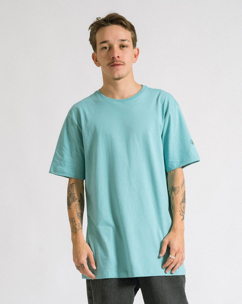 Camiseta Volcom Regular Solid Stone. Possui modelagem regular, estampa em silk na manga, assinatura Volcom na manga e viés contrastante.