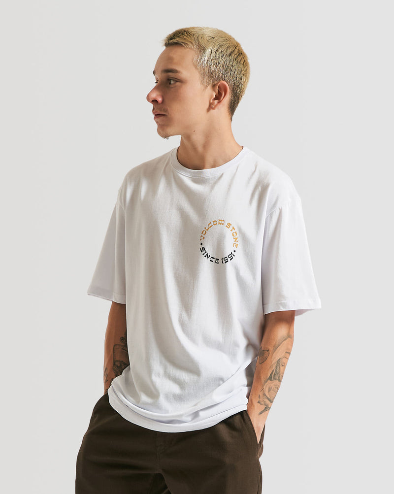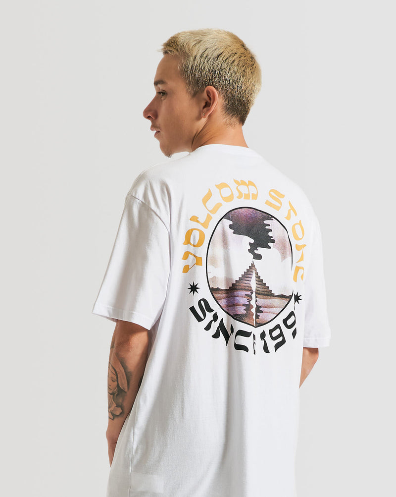 Camiseta Volcom Regular Stone Portal. Possui modelagem regular, estampa em silk frontal e nas costas, assinatura Volcom na manga e viés contrastante. Confeccionada em tecido algodão.