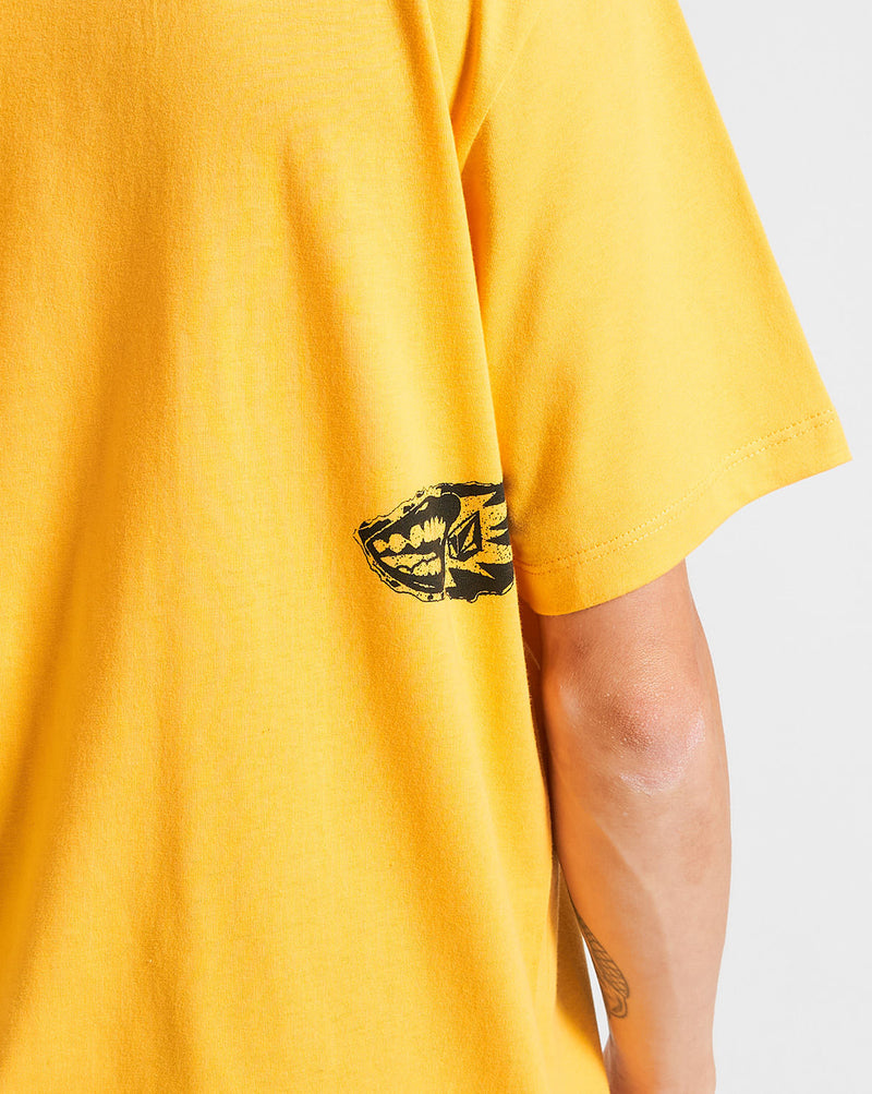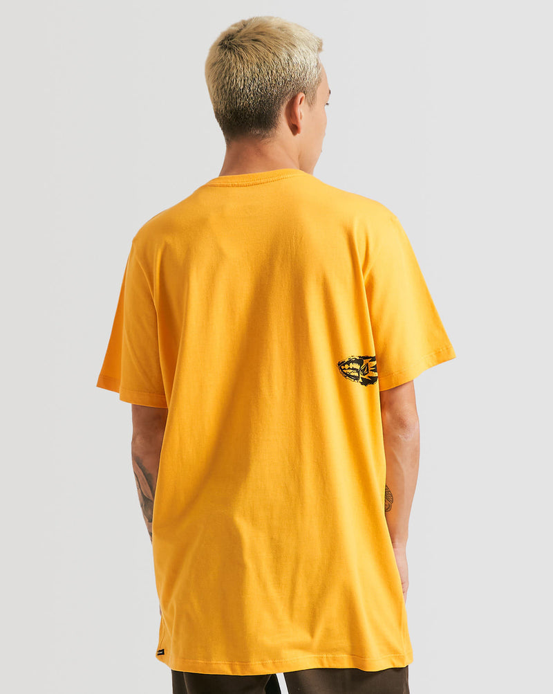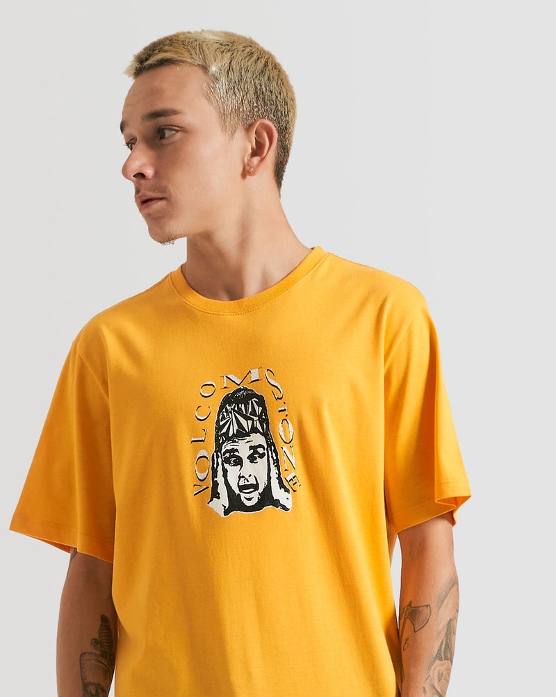 Camiseta Volcom Slim Headache. Possui modelagem slim, estampa frontal, assinatura Volcom na manga e viés contrastante. Confeccionada em tecido de algodão.