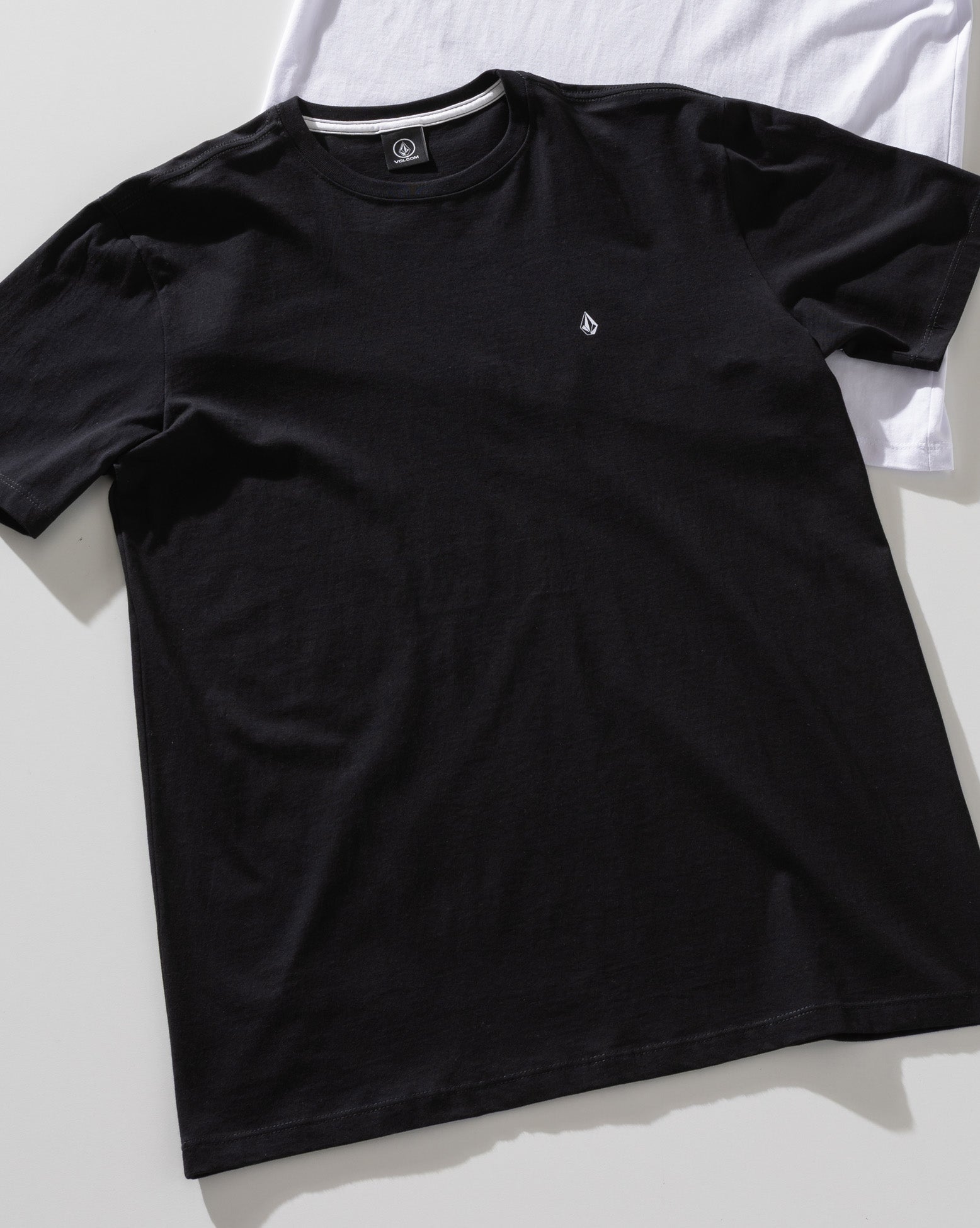 Camiseta Volcom Stone Blanks Preta. Possui modelagem regular, silk frontal, assinatura Volcom na manga, etiqueta interna e viés contrastante.