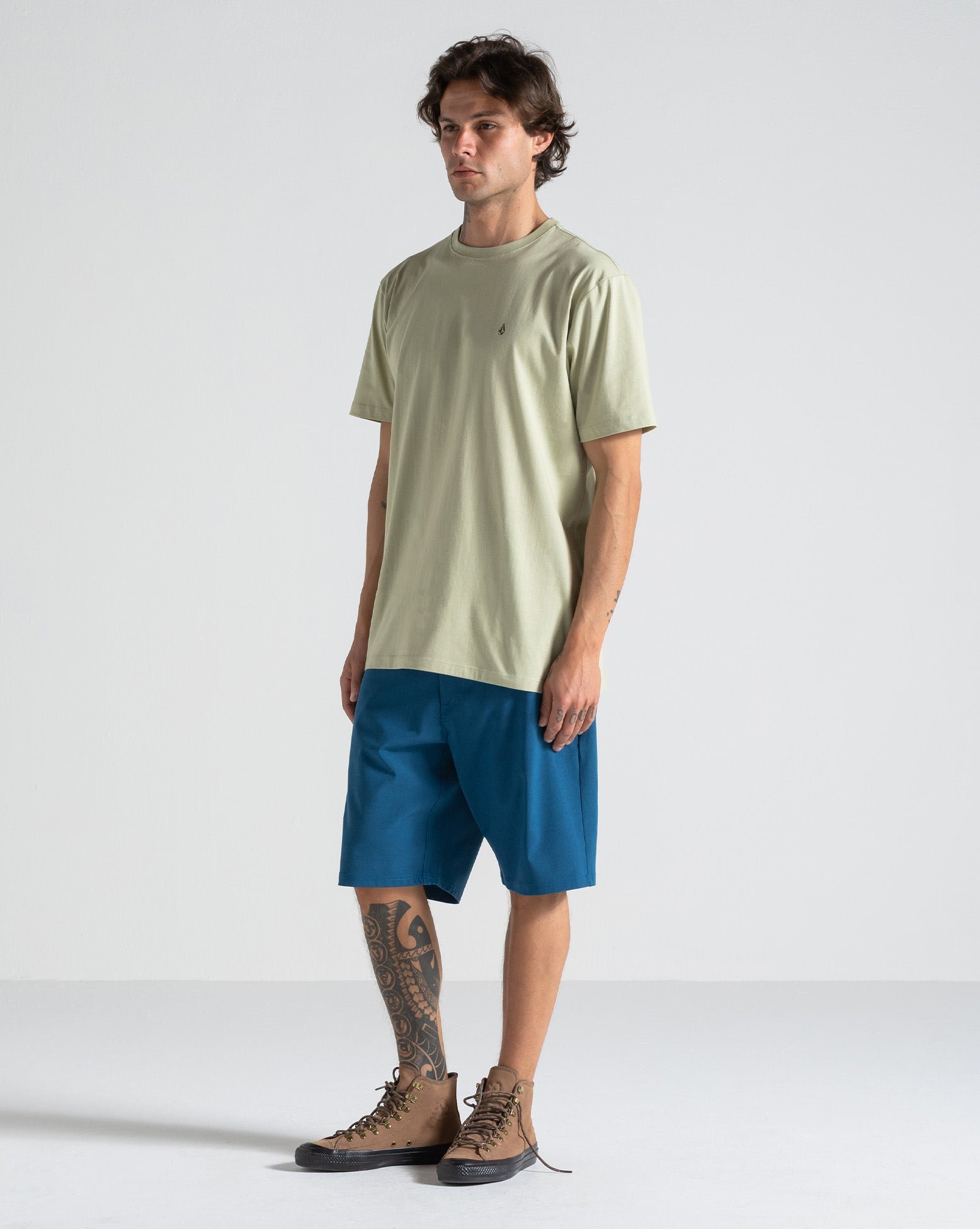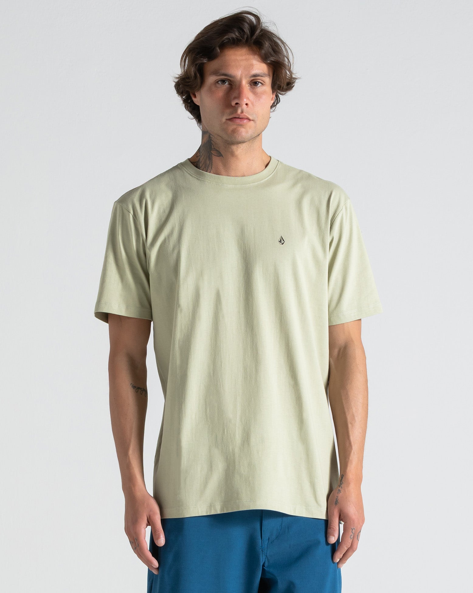 Camiseta Volcom Stone Blanks Verde Clara. Possui modelagem regular, silk frontal, assinatura Volcom na manga, etiqueta interna e viés contrastante.