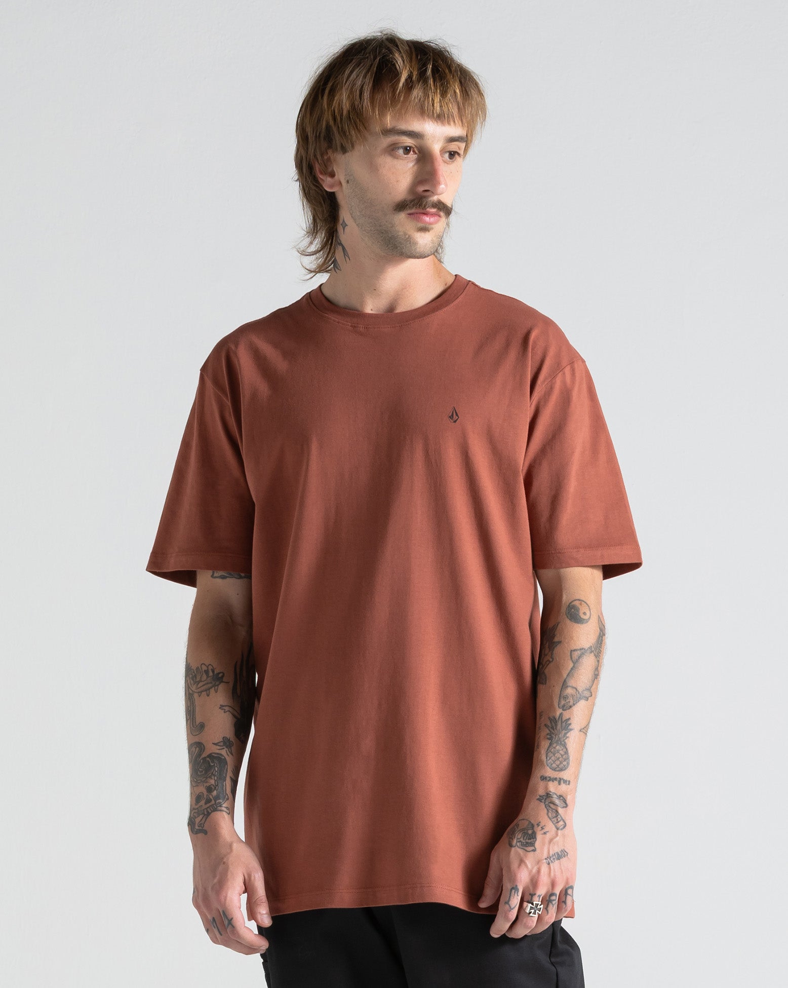 Camiseta Volcom Stone Blanks Vermelha. Possui modelagem regular, silk frontal, assinatura Volcom na manga, etiqueta interna e viés contrastante.