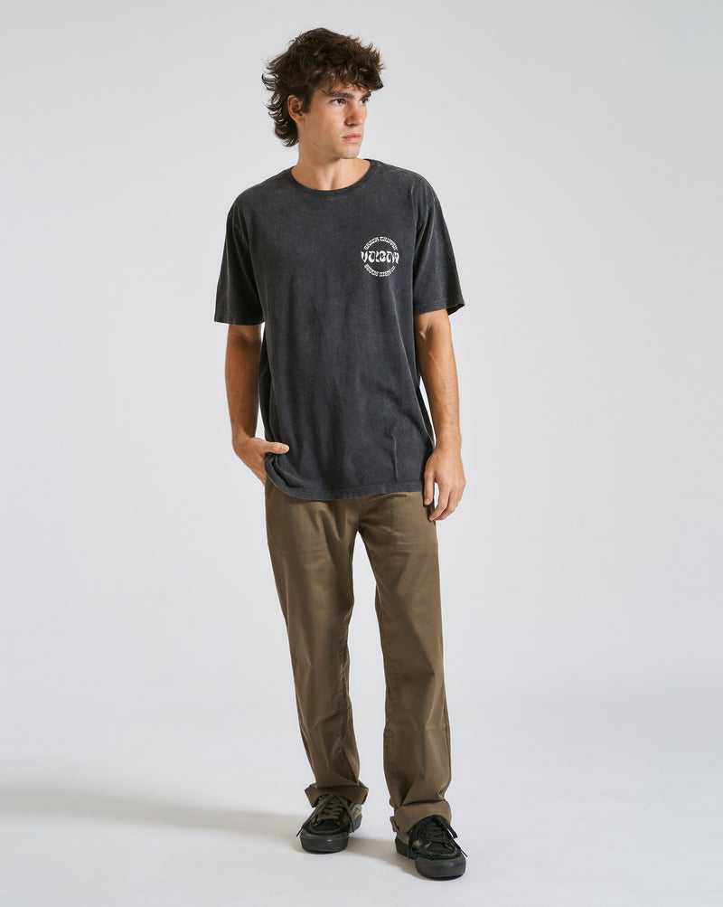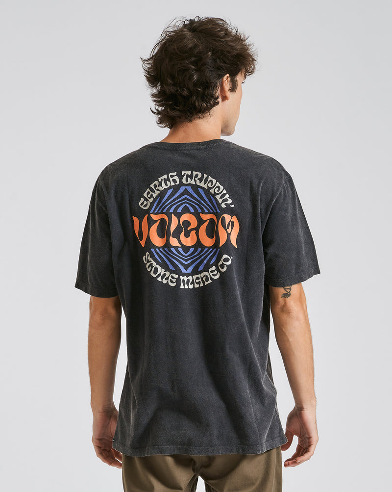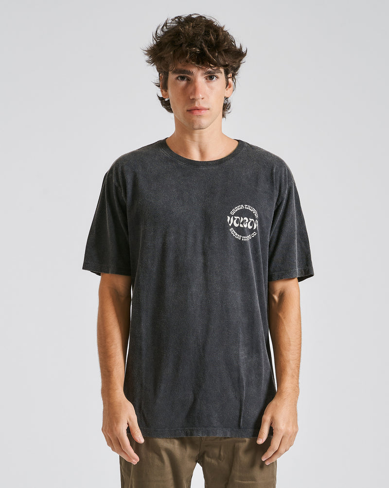 Camiseta Volcom Stoneature. Possui modelagem regular, estampa em silk frontal e nas costas, lavanderia efeito estonado, viés interno do próprio tecido e etiqueta Volcom na barra.