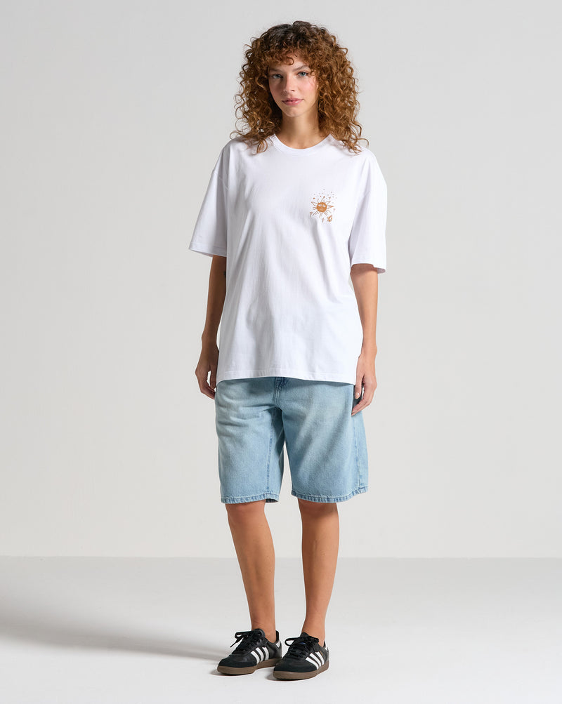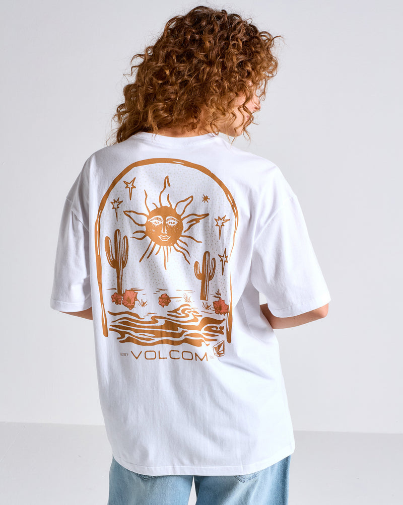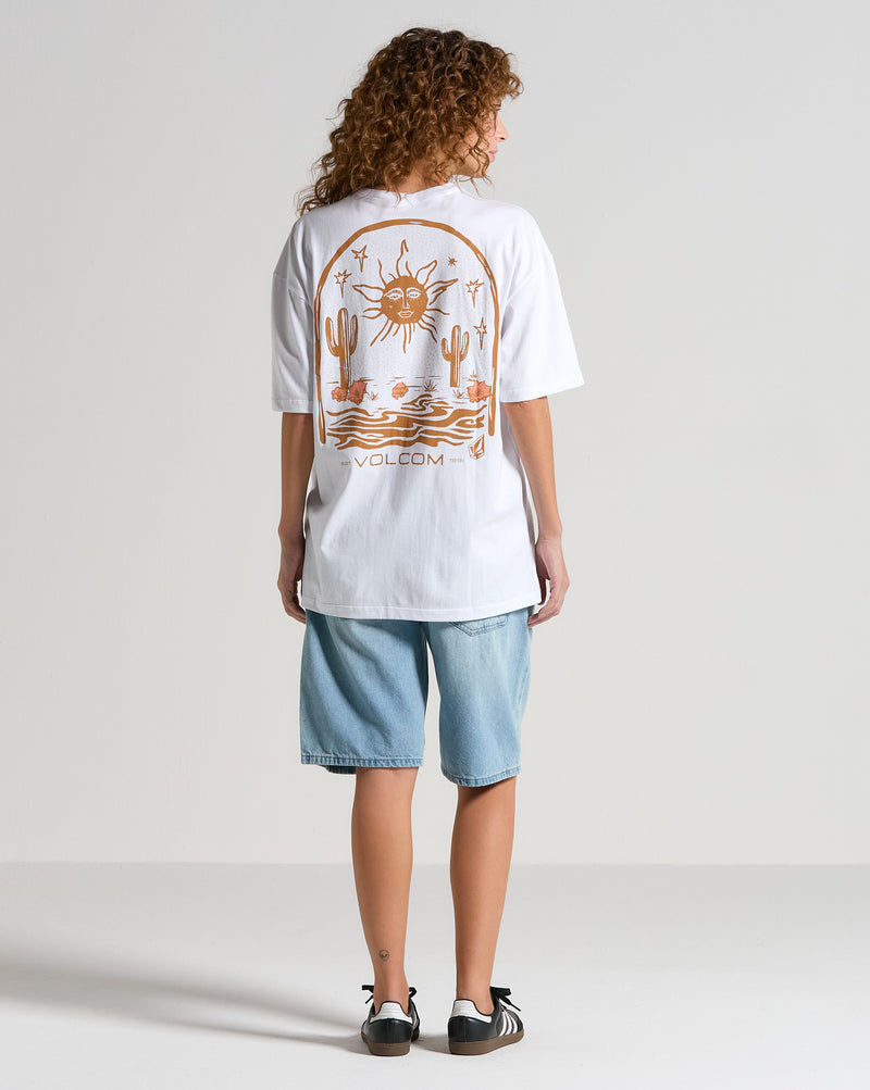 Camiseta Volcom Stones Throw. Possui modelagem oversized e estampa em silk frontal e nas costas.