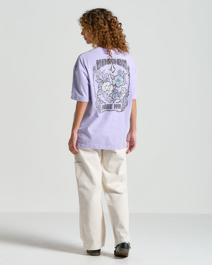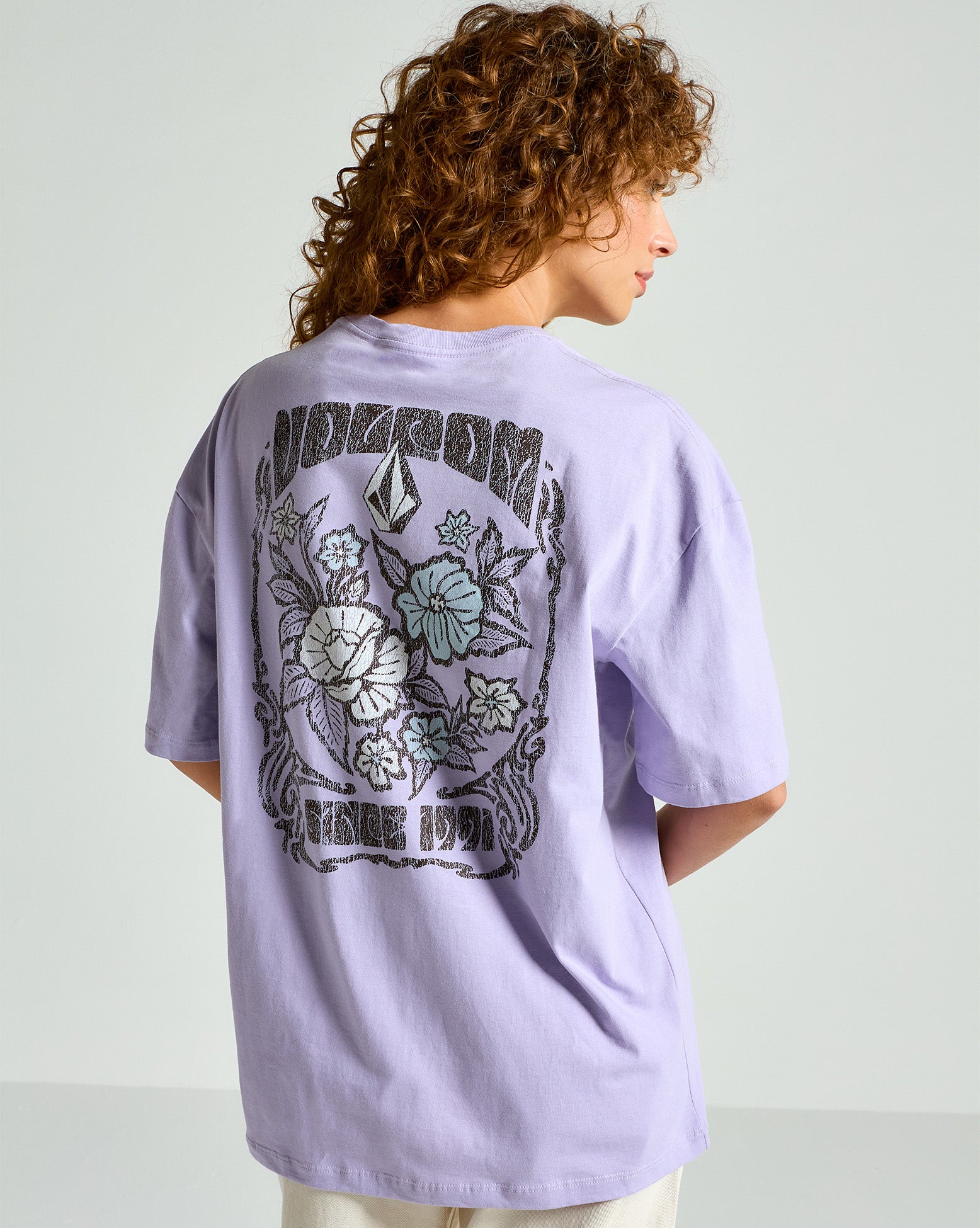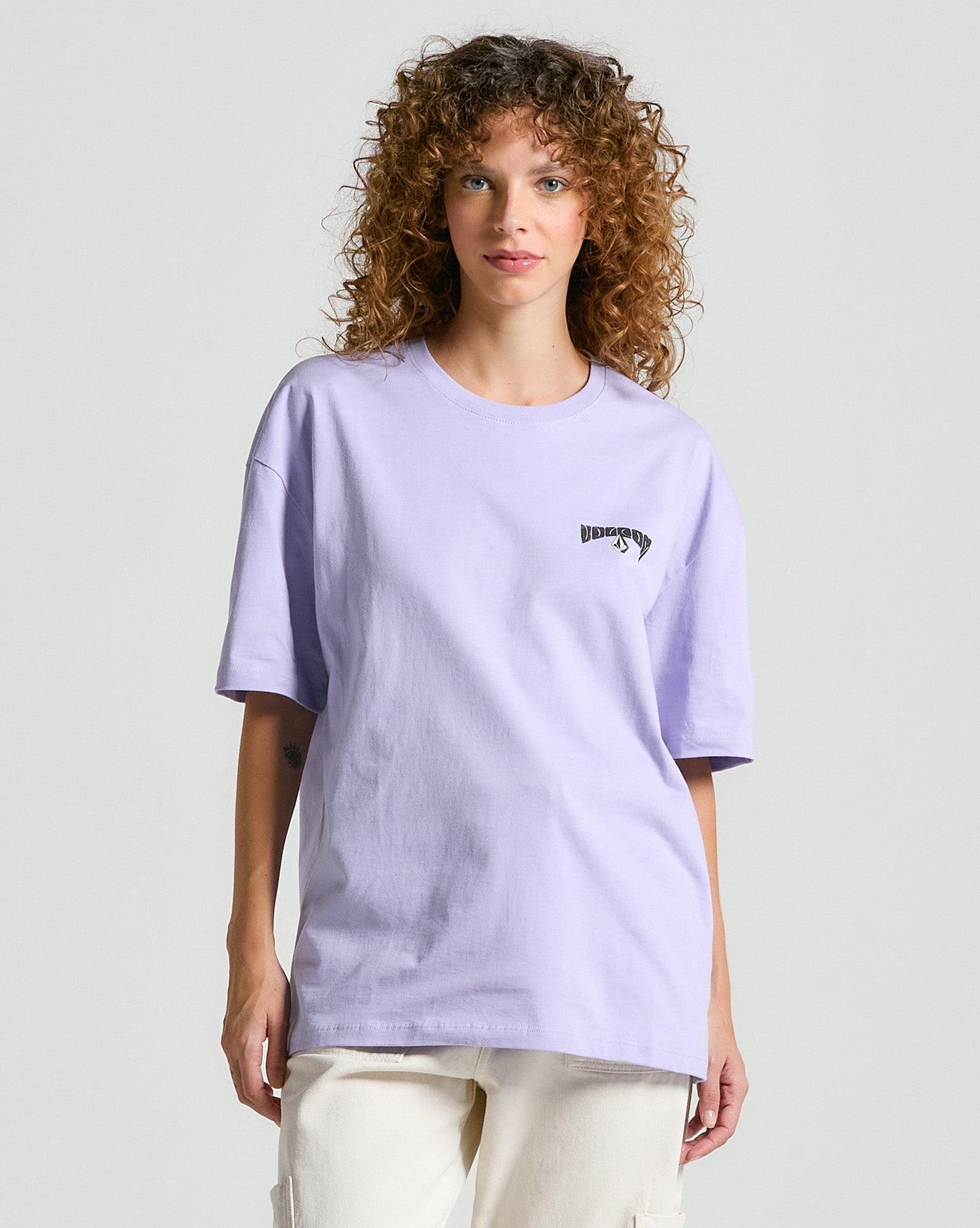 Camiseta Volcom Stones Throw. Possui modelagem oversized e estampa em silk frontal e nas costas.